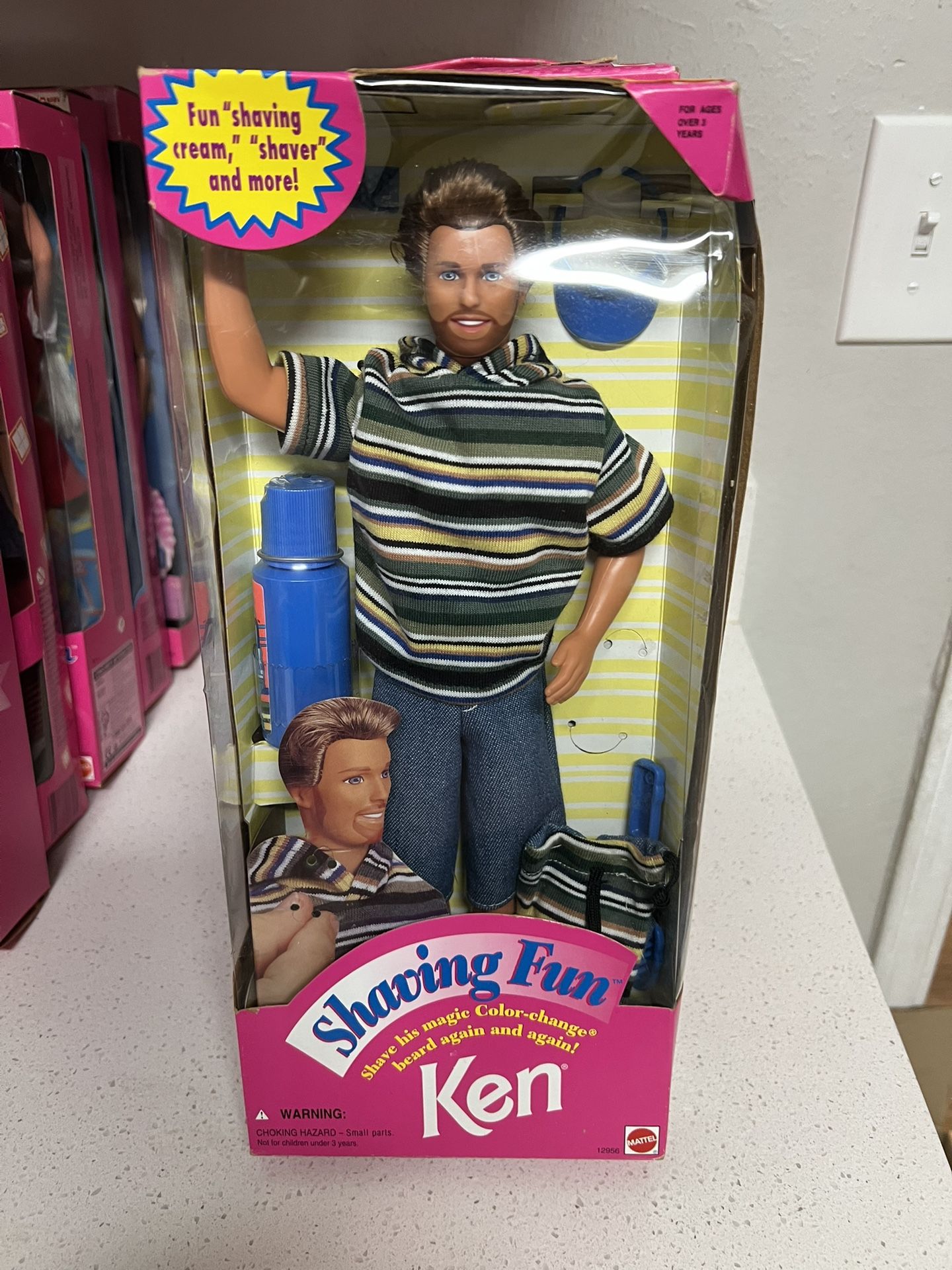 Barbie Shaving Fun Ken Doll from 1994, Mattel product number 12956. The doll has a "magic" color-change beard that can be "shaved" off with warm wate