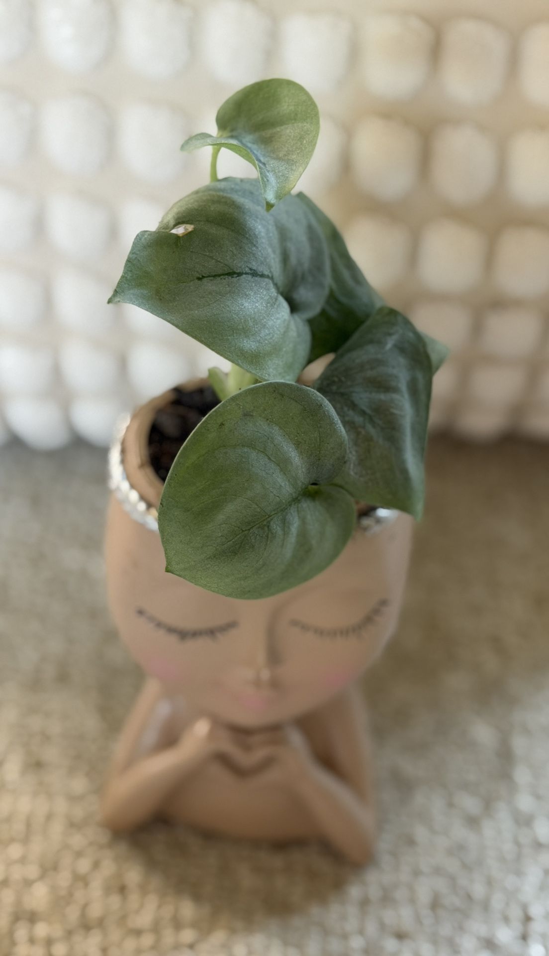 These silver Scindapus are well rooted. The resin girl planter measures about 4 inches tall. Pick up in Cerritos