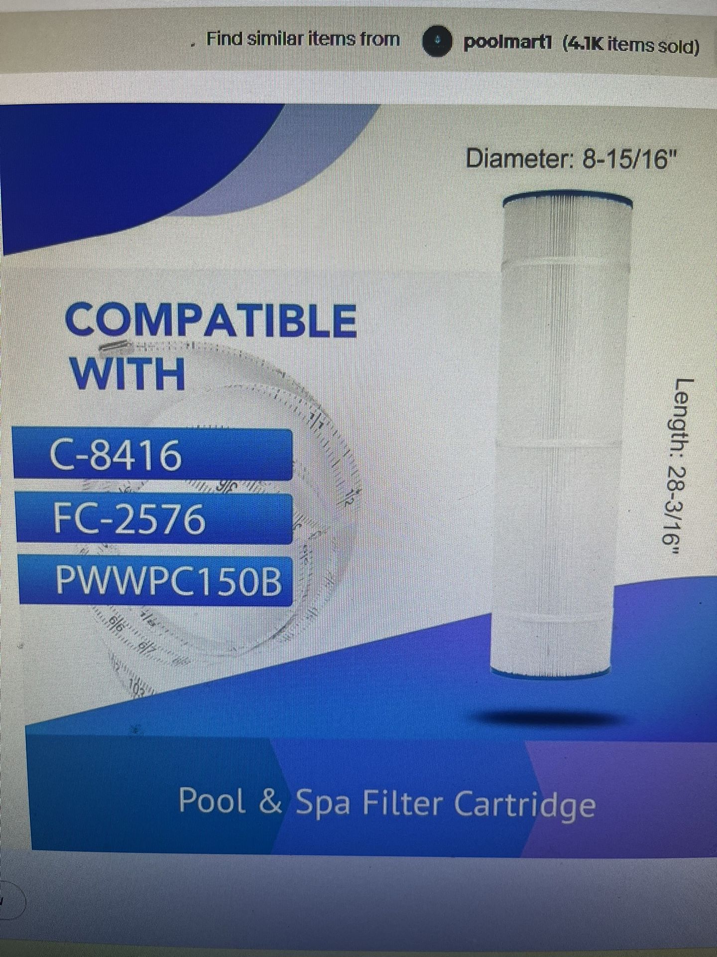 Brand new, still wrapped, and in the box. Replacement pool / spa filters, compatible with PWWPC150B, Posi-Clear PXC-150, C-8416, Filbur FC-2576, Darlly 81504. Brand is Yoozell and they are highly rated on their store on the big box website. See pics. $40 each. I have 4 of them.
