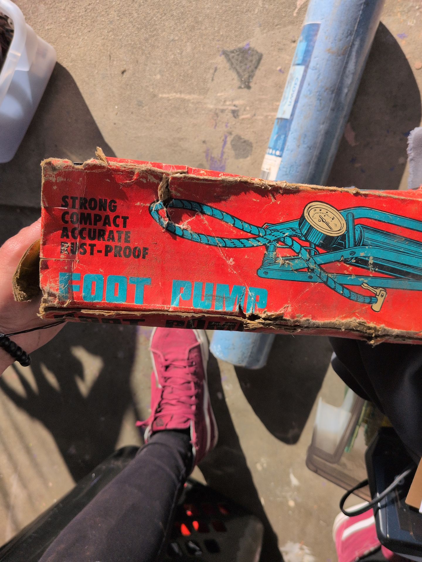 vintage-style portable foot pump used for inflating tires on bicycles or cars. Type: Single-barrel foot pump with an integrated pressure gauge. Purpose: Emergency roadside tire inflation. Features: Compact design for easy storage and a universal valve adaptor. Usage: Operated by stepping on the pedal to compress the cylinder and build air pressure.