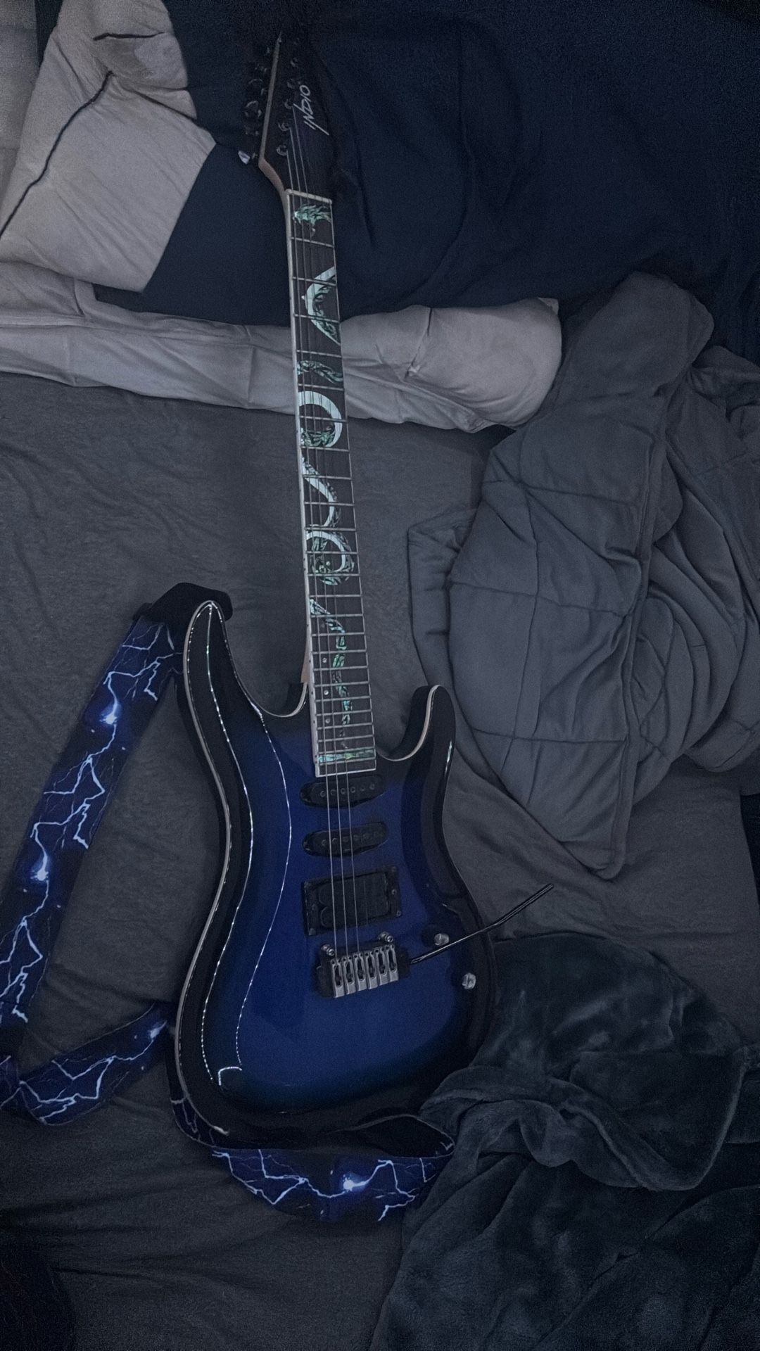 Added custom fret stickers and volume knobs, with strap included. Small chip on the corner. Works great still. Has whammy bar. 100 or best offer
