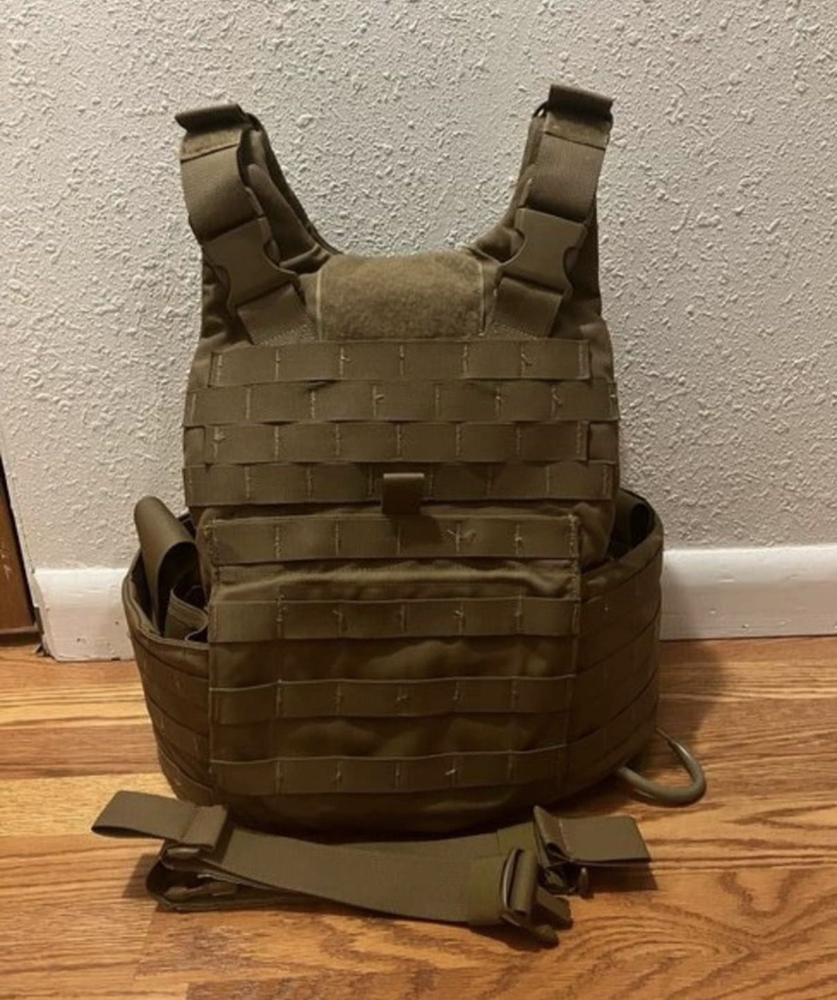 USMC Quick Release style plate carrier. Size: Small (SAPI). Color: Coyote Brown. Very Good condition. Comes with front, rear, and side soft ballistic panels. No hard armor plates are included. Inner elastic and outer MOLLE cummerbund.