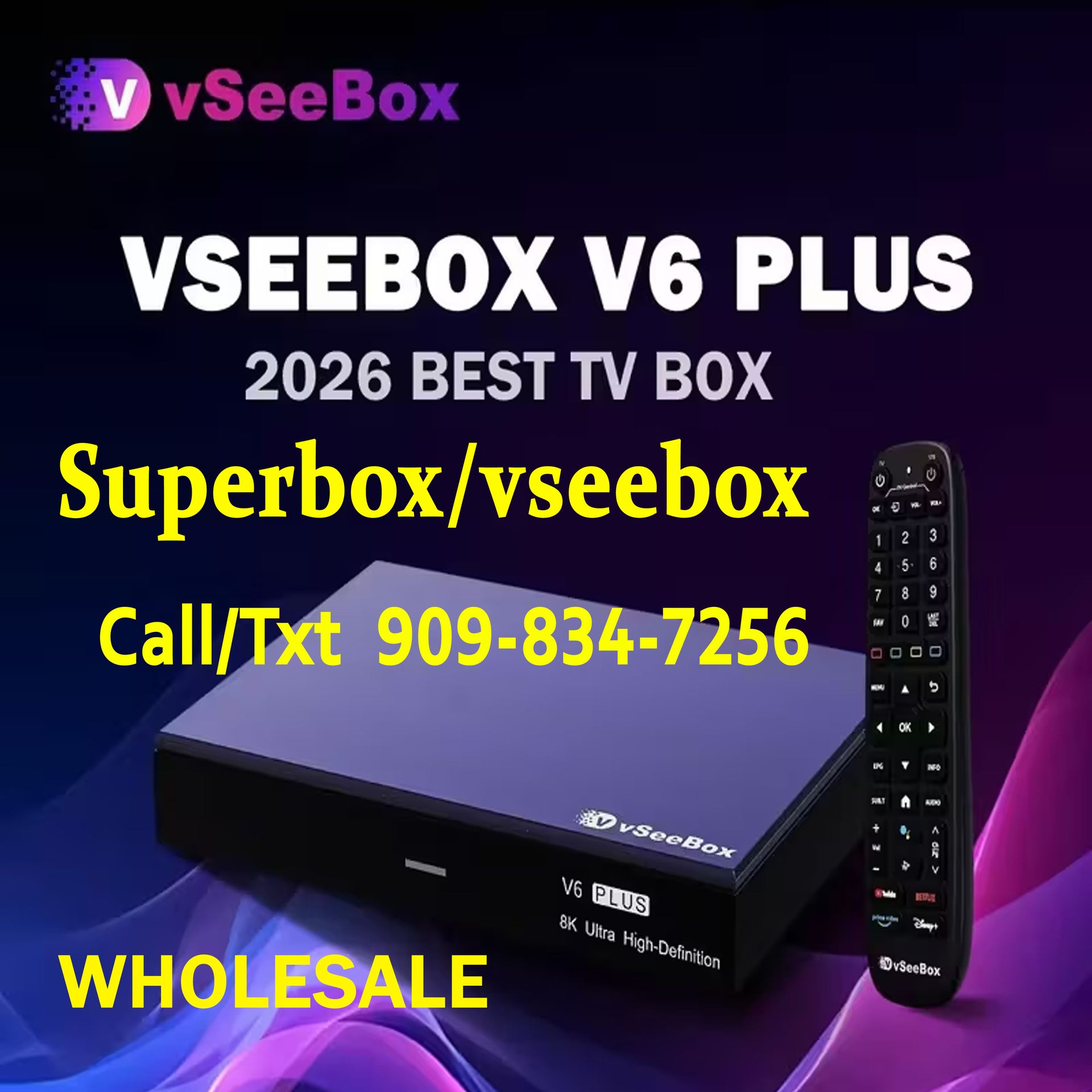 All-New Superbox S7 Max S7 Pro Superbox S6 Pro Max Ultra VSEEBOX ELITE ULTRA VSEEBOX V6 PLUS VSEEBOX V6 Max VSEEBOX V3 PLUS VSEEBOX ELITE MINI Experience next-level entertainment with our most powerful device ever. Featuring 6K resolution and the lightning-fast Cortex-A53 processor. Local pickup in Baldwin Park Ca!! Available with Lowest prices and price match guaranteed. Ask us about WHOLESALE prices. Vseebox v3 plus limited instock $230 each 2-5 box $220 each 5-10 $205 each VSEEBOX V5 PRO 1 BOX $195 2-5 BOXES $190 UNITS 6-9 BOXES $185 UNITS 10+ BOXES $175 UNITS 20 BOXES $170 UNITS More than 20 contact us for wholesale specials New Arrival 2025 Edition 💥VSEEBOX V6 PLUS ( 6 apps multi split screen ) NEW INSTOCK 🔥 1 BOX $240 2-5 contact for pricing 6-9 contact for pricing More than 20 contact us for wholesale specials New Arrival 2025 Edition 💥VSEEBOX V6 MAX NEW INSTOCK 🔥 1 BOX $200 2-4 contact for pricing 5-9 contact for pricing 10+ contact for pricing 20 contact for pricing More than 20 contact us for wholesale specials New Arrival 2025 Edition 💥VSEEBOX ELITE MINI (15 apps) - 1 unit $240 - $225 WHOLESALE PRICES 💥Vsee Elite Ultra. (21 apps) - 1 unit: $310 - Wholesale prices inquired New Arrival 2025 Edition 💥S7 PRO. 32Gb Storage - 1 unit: $170 - 2-4 units: $160 - 5-9 units: $155 - 10+ units: $150 💥S7 Max. 64Gb Storage - 1 unit: $180 - 2-5 units: $175 - 10+ units: $170 - 20+ units: $165 - 40+ units: $160 New Arrival 2025 Edition 💥S7 Ultra. 128Gb Storage - 1 unit: $190 - 2-5 units: $185 - 20 units: $180 - 40+ units: $170 💥S6 PRO. 32Gb Storage - 1 unit: $135 - 2-9 units: $130 - 10+ units: $125 - 20+ units: $120 💥S6 MAX. 64Gb Storage - 1 unit: $165 - 2-3 units: $160 - 4-9 units: $150 - 10+ units: $145 - 20+ units: $140 💥S6 ULTRA. 128Gb Storage - 1 unit: $180 - 2-3 units: $175 - 4-9 units: $170 - 10+ units: $150 - 20+ units: $145 💥SuperBox has 1 year manufacturers warranty 💥Store business hour💥 💥Location: 4219 alderson ave unit C. Baldwin Park 91706, CA 💥 Mon-Sun 10 AM - 5 PM, Call/Text Us Now (909)834-7256 Free Lifetime Updates: Powered by 4GB of RAM and 64GB of storage, this device is a multimedia powerhouse. Enjoy ultra-fast streaming with support for a 1000Mbps Ethernet connection, dual-band WiFi, and the latest WiFi 6 technology. Plus, the upgraded Bluetooth remote with voice command makes navigating your content easier than ever. Content - 6K Media Player - Android TV Box - Free Lifetime Updates - Home Entertainment - Online Content Don't miss out on the chance to transform your living room into an entertainment paradise. Take the plunge into the future of the SuperBox S7 Max Media Player today!