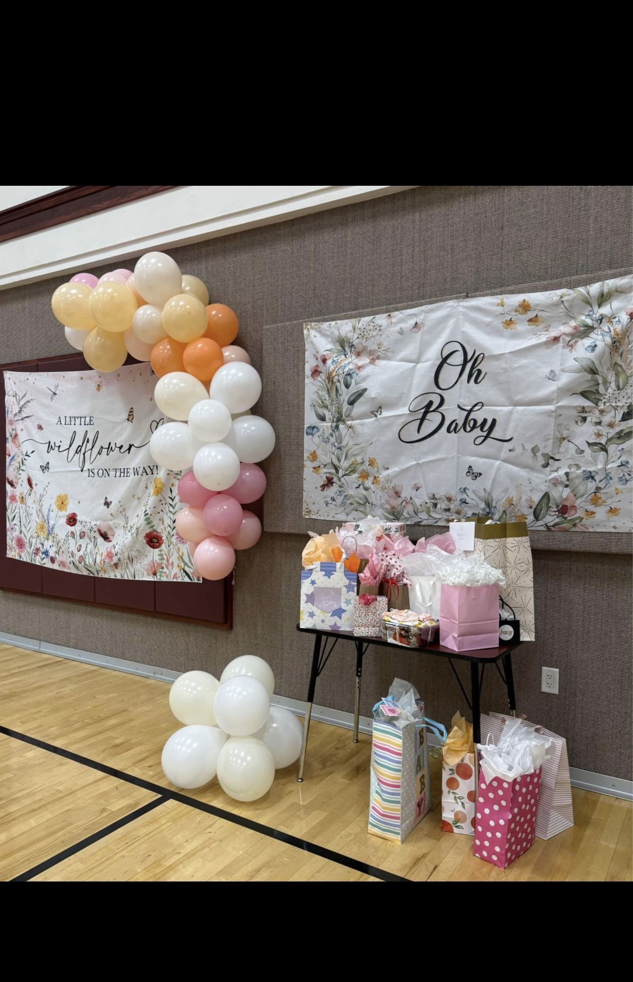 Two banners, baby in bloom gift bag stickers, Diaper raffle sign with cards, Mom-osa bar easel and two table cloths.