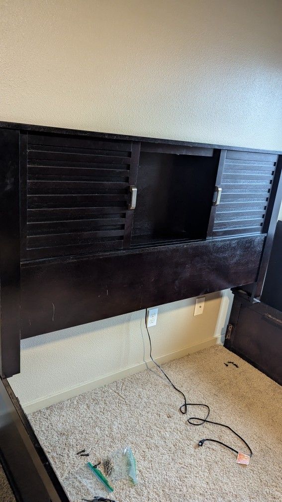 Platform bed with two storage drawers, reading light hidden nook and bookshelves