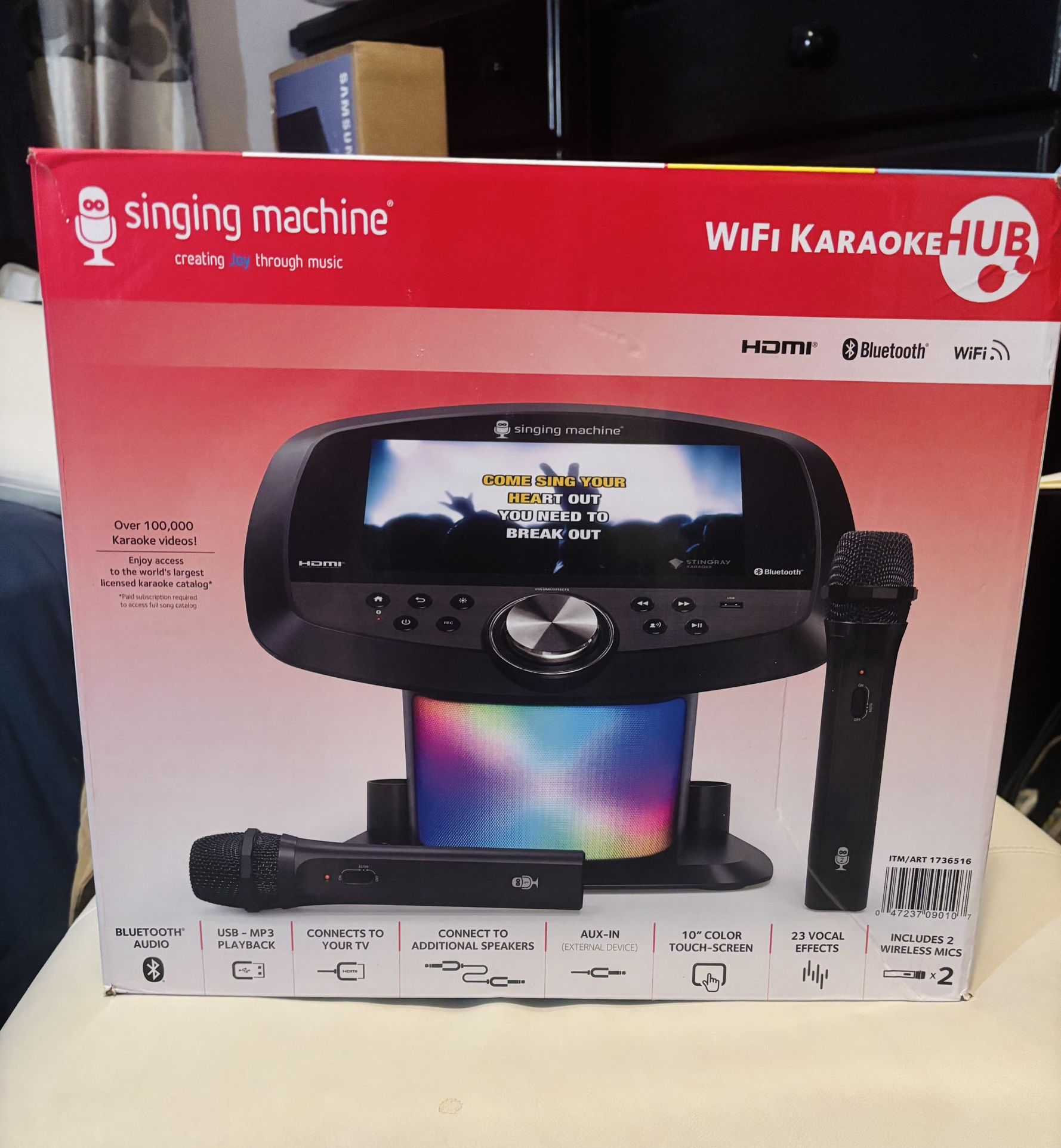 Comes New, Open Box. Available for pick up. Message for any questions. We speak Spanish as well. π FOLLOW MY PAGE FOR MORE ELECTRONICS π π Key Features & Specs π βββββ π WiFi Karaoke Hub System β’ Access over 100,000+ karaoke videos through the Singing Machine platform β’ Stream directly over WiFi for a true smart karaoke experience β’ Perfect for home parties, family nights, and events π 10β Full-Color Touchscreen Display β’ Large, responsive touch screen for easy song selection β’ Lyrics displayed clearly for an immersive sing-along experience β’ Simple, intuitive interface β no assembly required π HDMI + Bluetooth + WiFi Connectivity β’ HDMI output to connect directly to your TV for big-screen karaoke β’ Bluetooth audio streaming from phones, tablets, and laptops β’ WiFi connection for seamless online karaoke access π Dual Wireless Microphones Included β’ Comes with 2 wireless microphones for duets and group performances β’ Clear vocal pickup with adjustable vocal effects β’ Great for kids, adults, parties, and competitions π Built-In Vocal Effects & Audio Controls β’ 23 built-in vocal effects to enhance performances β’ Individual mic volume, echo, and music controls β’ Create a professional-style karaoke sound at home π Expandable Audio System β’ AUX-in for external devices β’ Connect to additional speakers for louder, room-filling sound β’ Ideal for living rooms, game rooms, and gatherings π LED Light Show Base β’ Multi-color LED lighting synced to the music β’ Adds visual energy to every performance β’ Elevates the party atmosphere instantly π All-In-One Karaoke Entertainment System β’ No assembly required β plug and play β’ Perfect for birthdays, holidays, family nights, and events β’ A complete karaoke solution in one sleek unit