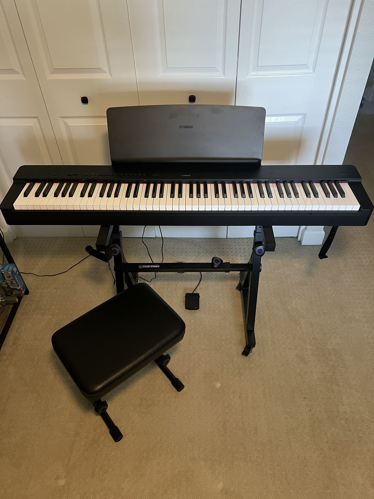 Selling my Yamaha P-225 digital piano with liquid stands adjustable stand and seat. This is Yamaha’s newest compact weighted model with their GHC (Graded Hammer Compact) action and CFX Grand Piano sampling. It’s perfect for beginners to advanced players who want an authentic piano feel without the size of an acoustic. Features: • 88 fully weighted keys (GHC action) • Premium Yamaha CFX Grand Piano sound engine • Built-in speakers • USB-MIDI connection (works with iPad, GarageBand, Smart Pianist App) • Multiple voices, metronome, recording function • Very slim modern design — fits apartments and small spaces • Yamaha reliability and build quality Condition: Light cosmetic dust but otherwise excellent. All keys and functions work perfectly. Included: • Power supply • 1 pedal • Liquid Stands - Adjustable bench and stand