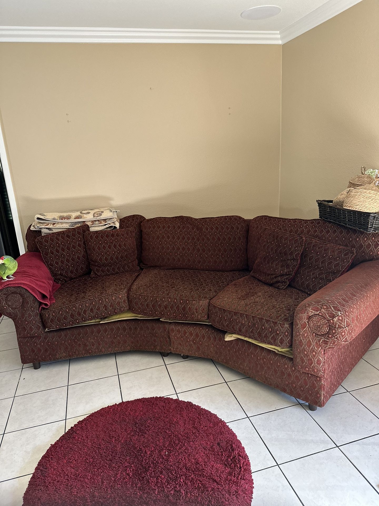 Burgundy small sectional couch no stains no rips very comfy. Good for a small place.