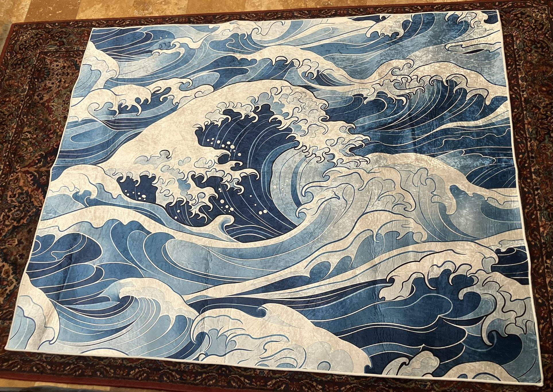 Brand new, never used light weight rug/ mat. Measurements about 78.5 inches x 63 inches. The material is like a velvet look and feel. Will flatten out, was just folded up. The back has anti-slip grip. Comes from a smoke free home.