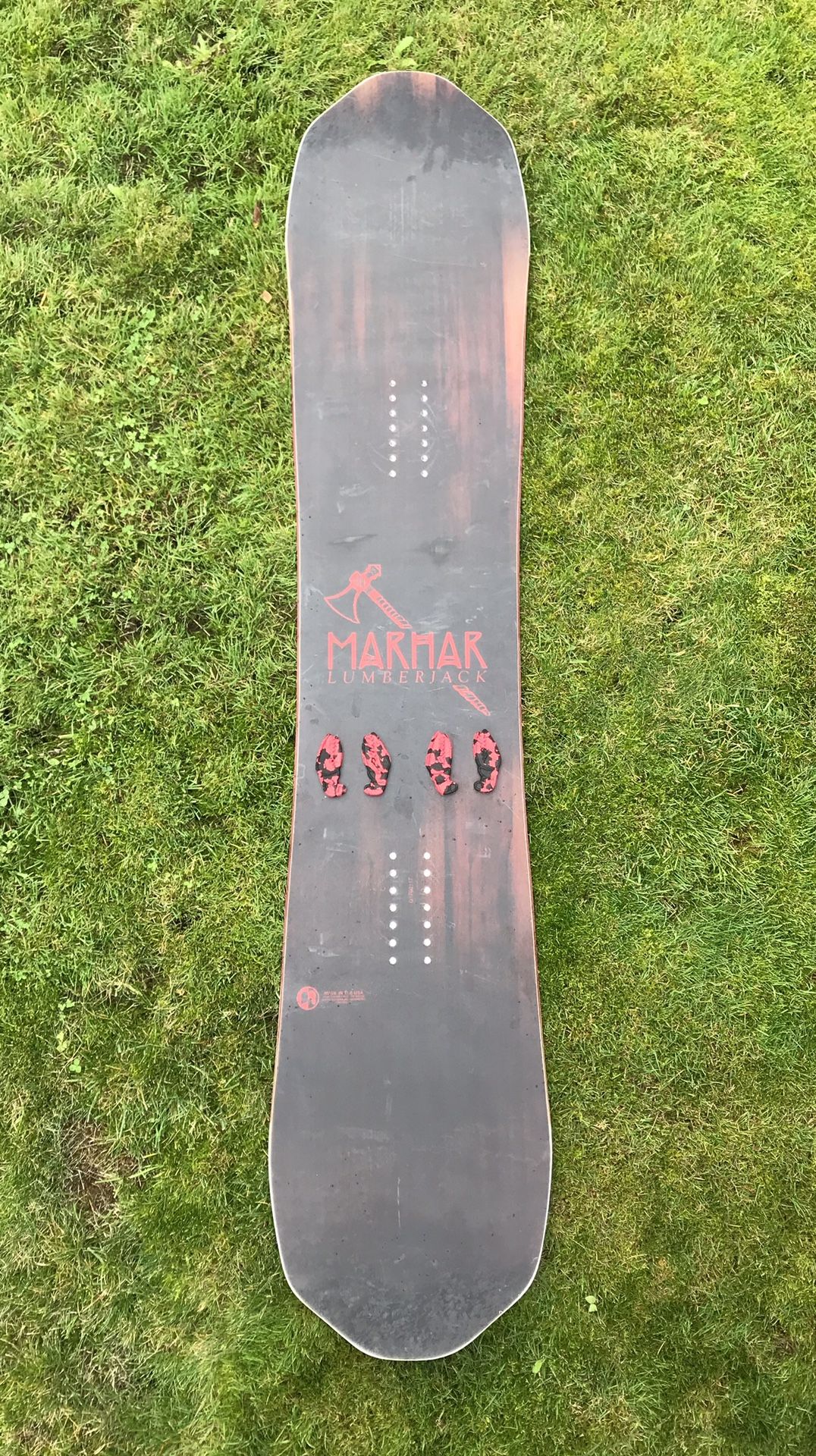 Marhar Lumberjack 155 from 2016/2017 release. VERY fun all mountain pow park carve short/fat twin. The board has a lot of tech going into it including a 3D contoured base that makes it plane up very well in pow and is very catch free but still most stable than a normal flat to rocker board. The flat to rocker profile feels very much like riding with both feet on top of the bolts on a skateboard, and the ultra-wide base pushes the skate feel even further. I highly recommend checking out the marhar website for more info on this board, it's very unique. {url removed} This 2016/2017 model is the first year they did the lumberjack and hasn't changed in the past two years. I'm letting go of it only because they came out with a new larger size, which will match my 6'4" 240lbs frame much better. That being said, this thing still worked very well for me -- no booting out with size 13 boots even railing out carves. It's a extremely versatile size that works from 5'10"/150lbs and up. Board is in great shape, probably about 20 days ridden on it and only light cosmetic damage to the top sheet. Base is in great shape too, I'd rate it a 8/10, only two very very light scratches. I take excellent care of all my boards, keep them waxed and edges taken care of. (note: this board has a matter finish that doesn't photograph super great off snow, but looks bad-ass and is def an eye catcher on the hill. get many questions about her.) Avalible with bindings if anybody wants, have a couple options (now pilot, burton cartel) -- email for more info/pics of those.