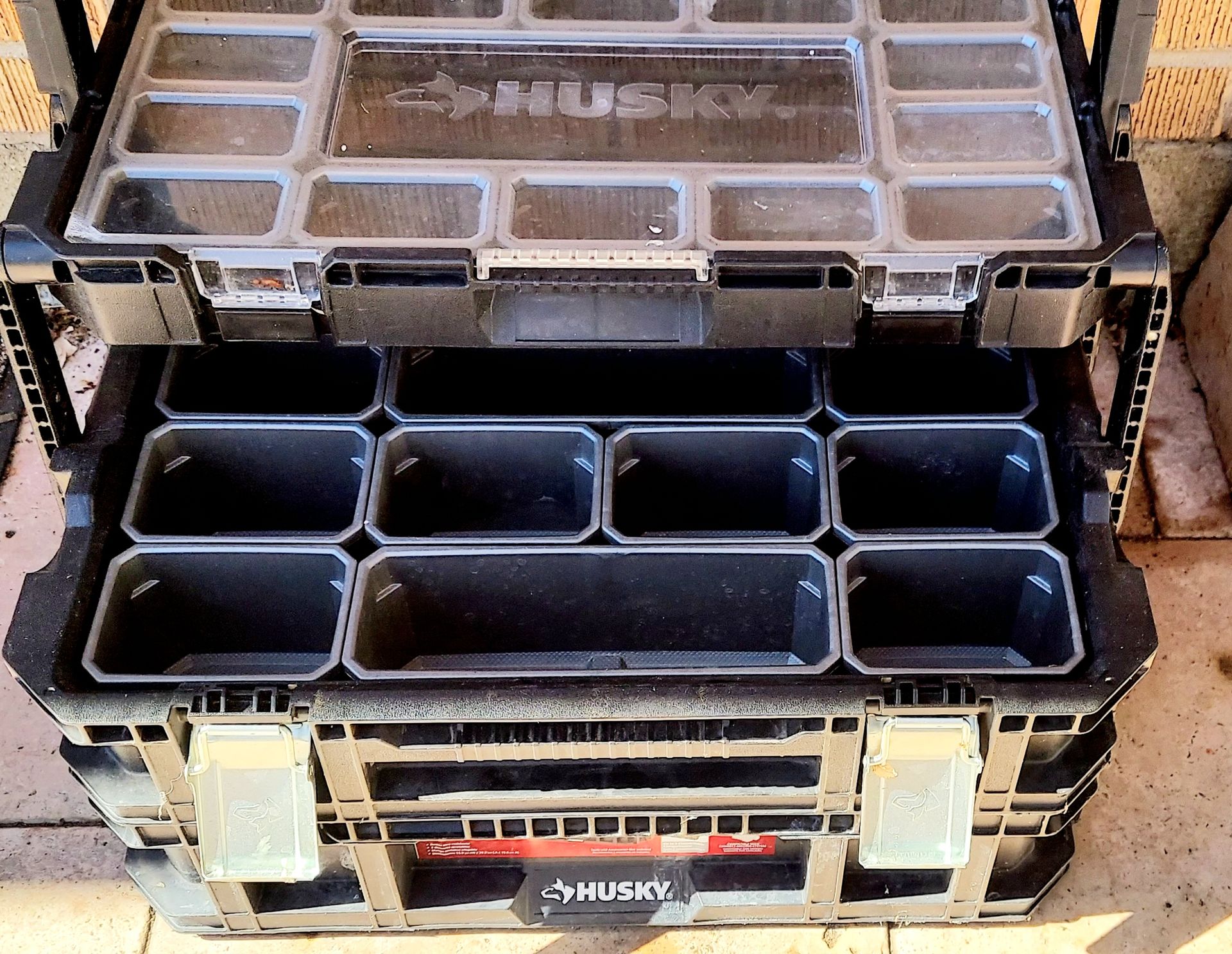 Husky 22-Inch Connect Caddy Construction: Made of heavy-duty resin with a folding metal handle. Storage: Features 5 customizable compartments using 3 adjustable dividers. Compatibility: Equipped with interlocking latches that allow it to stack and connect with other units in the Husky
