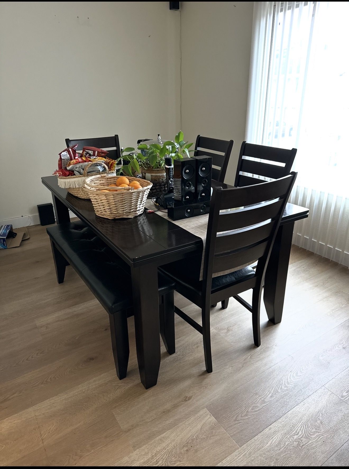 Dimensions Table (L 5ft 6.5 inches) (W 3ft 3.5) Chair x 4 (W 1ft 7 inches) (H 3ft 5inches Bench (L 4ft 2 inches) (W 1ft 6 inches) (H 1ft 8inches ) I have to move out. And need to get rid of it asap Willing to negotiate