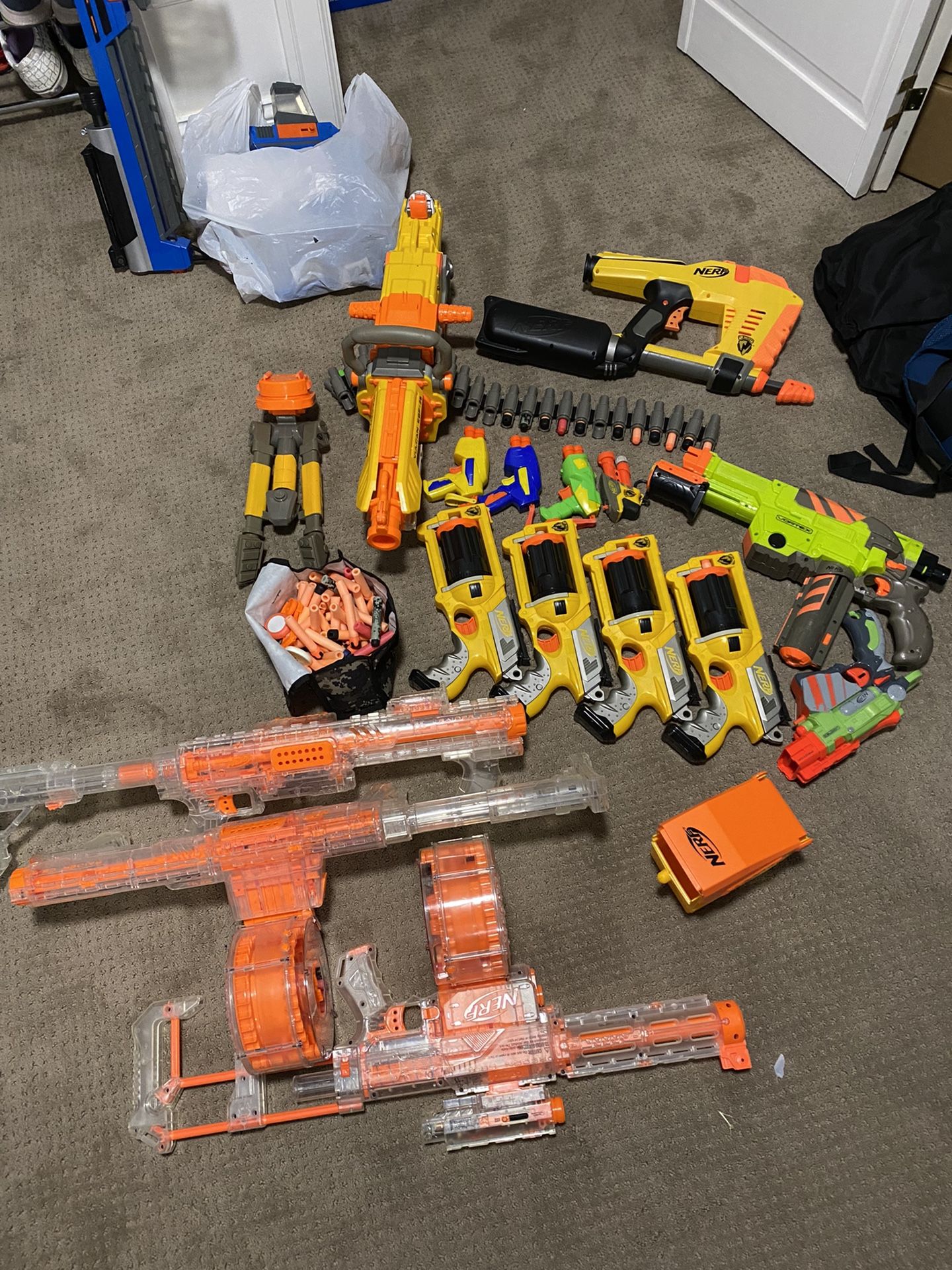 Most of the guns are fully loaded and I still have ample extra bullets, would much rather sell all together but I can do separate pieces, all the guns work perfectly and haven’t been used in ages, only the three small guns in the last pic are not nerf banded.