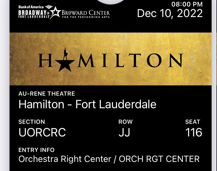 Hamilton at Broward Center 2 great orchestra seats Row JJ $300 for both !! can send electronically