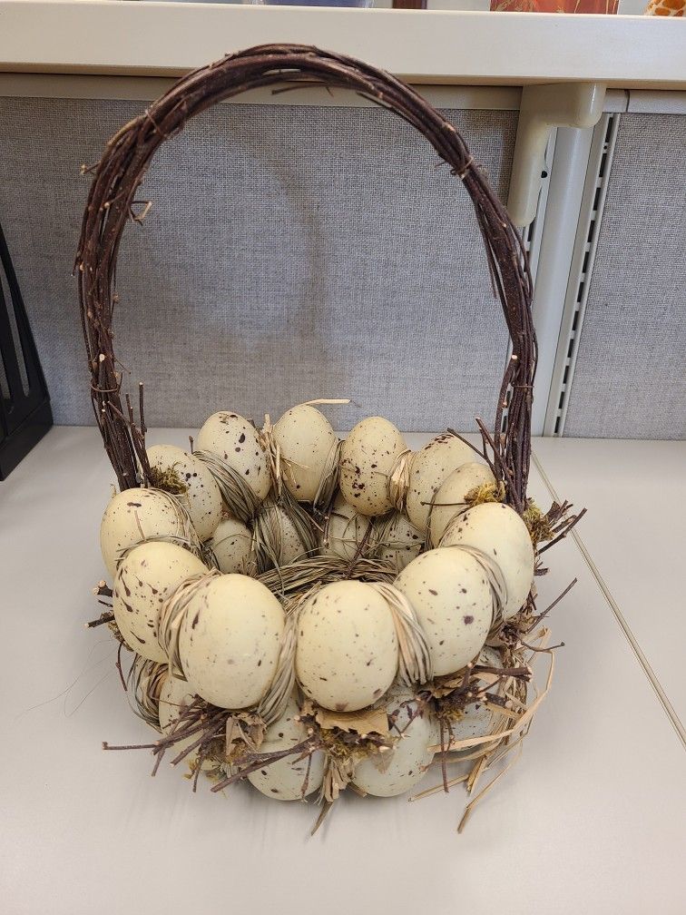 Decorative Easter Basket for Sale 11" Tall Some of the paint has chipped on the bottom row of eggs, as shown in my last picture $10
