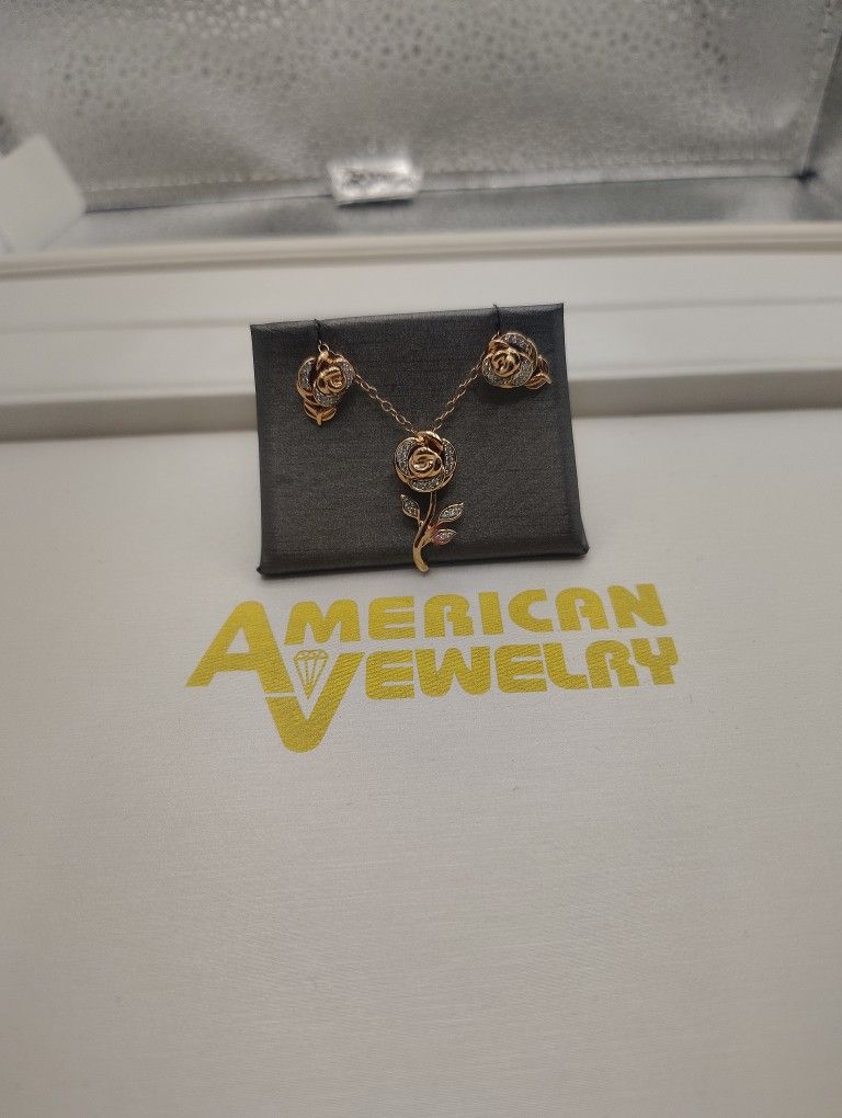 10k Rg Beauty And The Beast Rose Charm And Earring Set