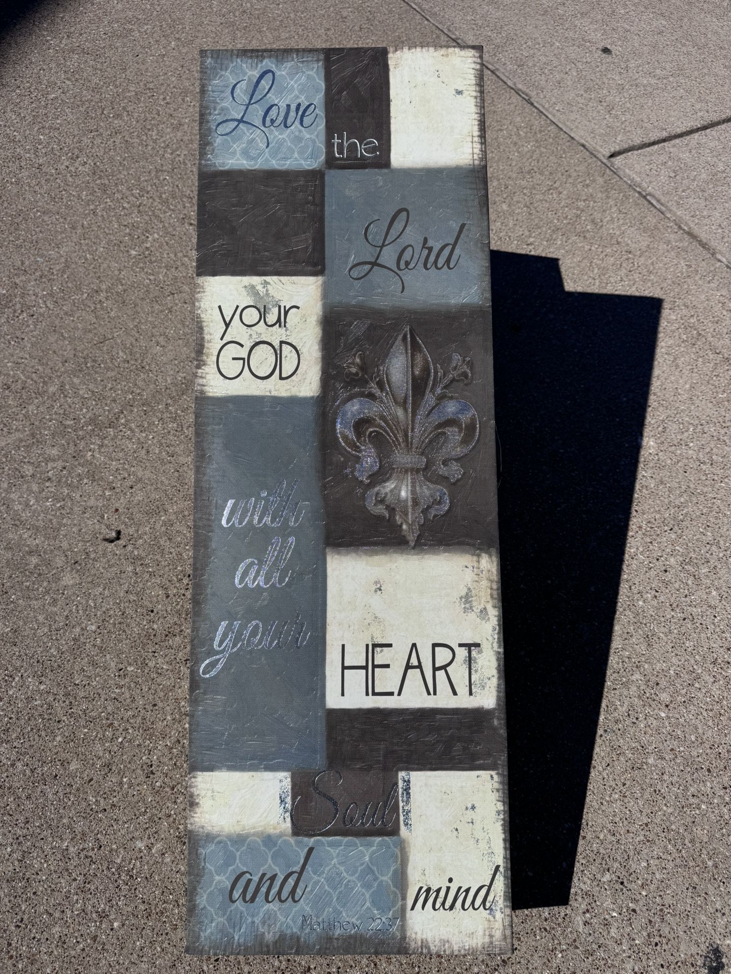 Fleur de lis, “Love the Lord your God,” soft tones. 12” wide and 35” tall.