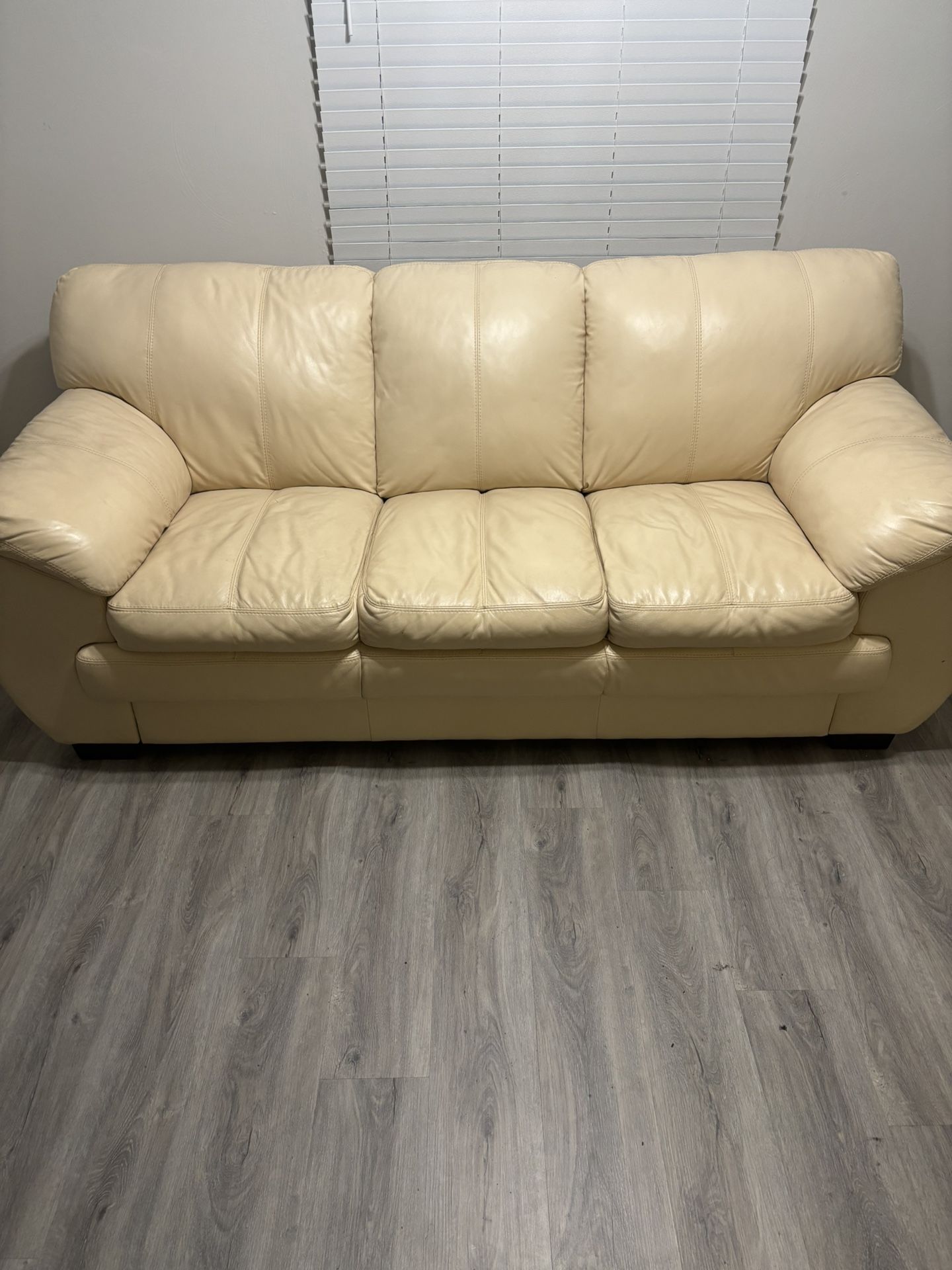 Extremely sturdy leather couch ! Heavy duty and real leather it’s comes as a stand along couch and is a nice size