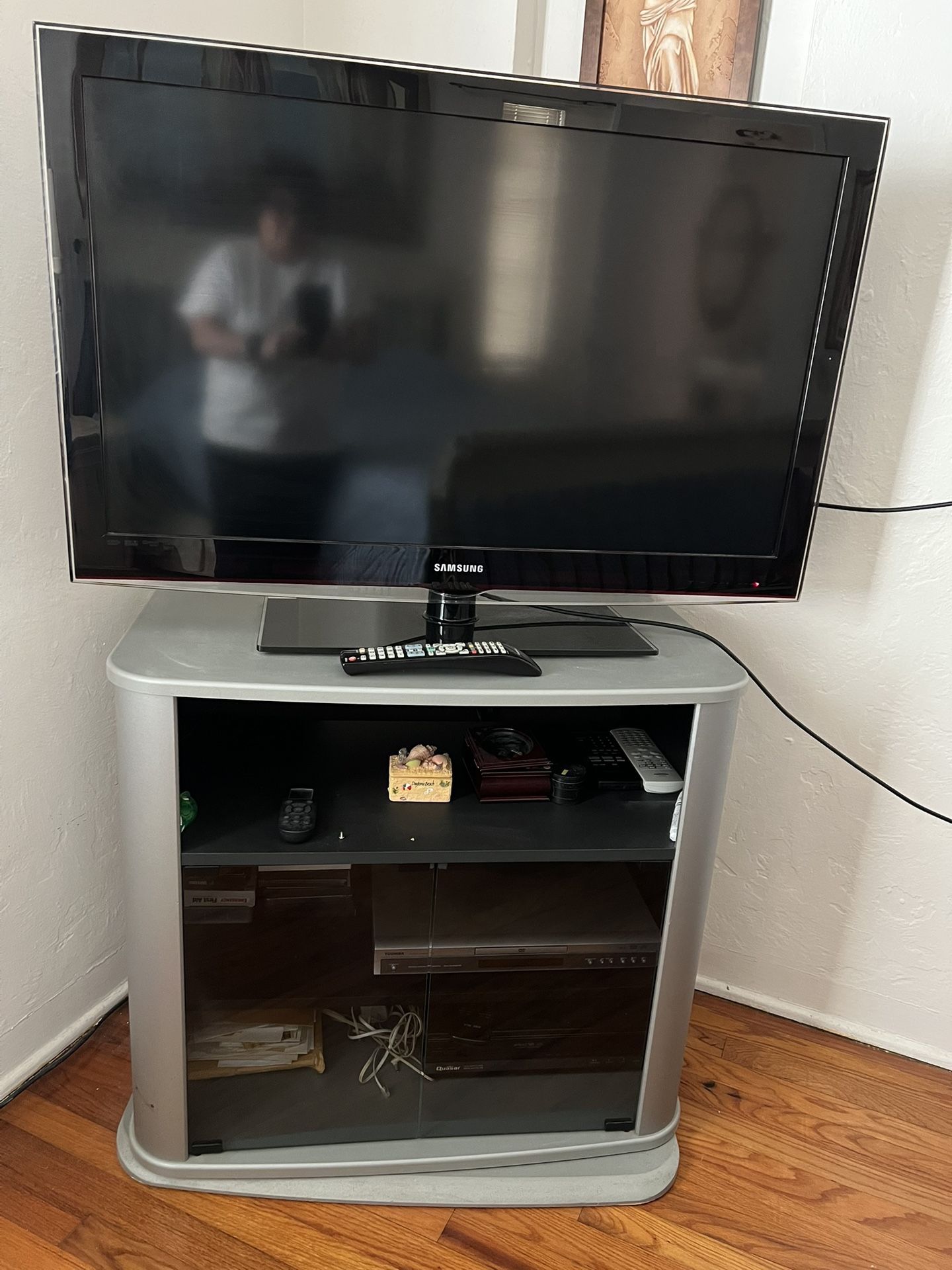 TV Table nearly brand new in excellent condition. Glass doors and extra shelving the color is light grey. Mobile table