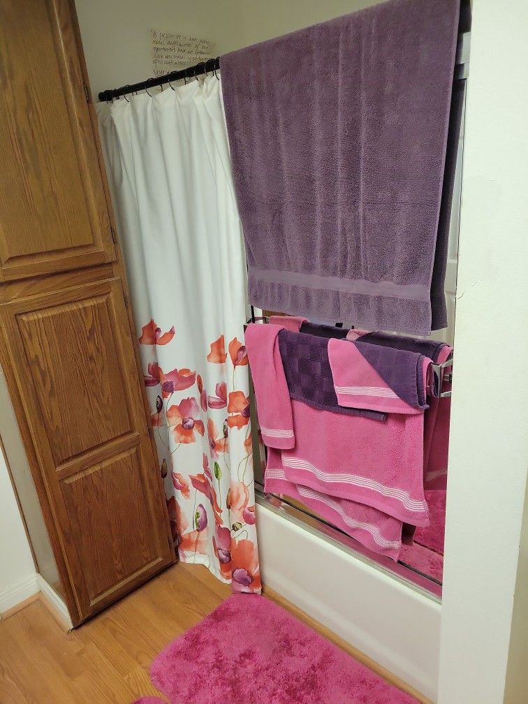 2 rugs, 2 big towells, 4 small towels, 1 shower curtain, 1 loción glass container and 1 liquid soap container, everything in good condition Hablo español