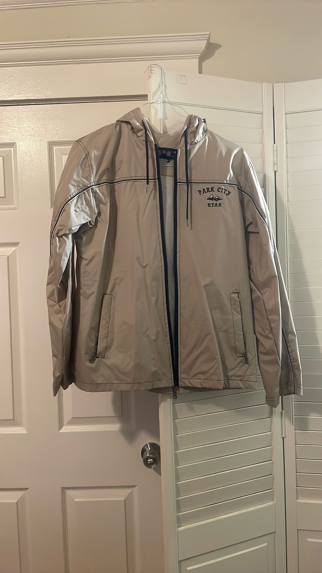 - Zipper does not work properly - 100% polyester - Size Large fits medium - Beige/tan color