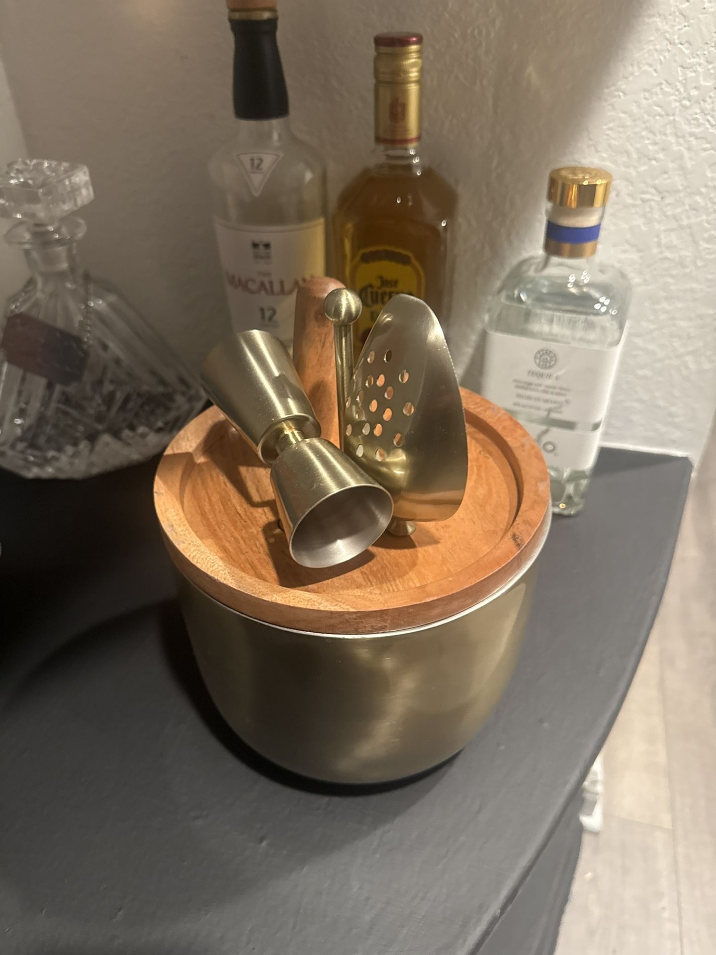 Brushed metal ice bucket with solid wood lid and matching bar tools (jigger, strainer, muddler, bottle opener). Clean, modern look with a mid-century feel. Good condition with light wear from use. Fully functional and ready for a home bar or bar cart.
