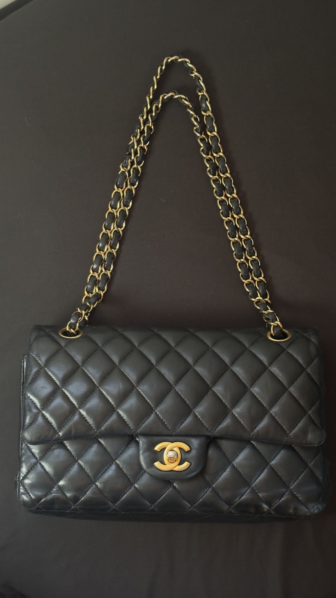 The Ultimate Investment Piece Up for sale is a stunning, authentic Chanel Classic Double Flap in buttery soft black quilted lambskin with signature 24k gold-plated hardware. This is the quintessential Chanel piece that continues to appreciate in value every year. Product Details: • Material: Quilted Lambskin Leather • Color: Black with Burgundy Interior • Hardware: Gold-Tone (GHW) • Features: Double flap closure, CC turn-lock, adjustable leather-threaded chain strap, and multiple internal compartments. Condition Report: • Exterior: Excellent vintage condition. The leather is supple with a beautiful luster. Minor softening to the structure, consistent with gentle use. • Hardware: Shiny with minimal hairline scratches; the gold plating is vibrant. • Interior: Clean burgundy lining; all pockets are functional and free of peeling or stickiness. • Corners/Edges: Very well-maintained with light rubbing barely visible to the eye. Authenticity & Shipping: 1. Guaranteed 100% Authentic. 2. Fast Shipping: Items are packed securely and shipped within 24 hours of payment with signature confirmation.