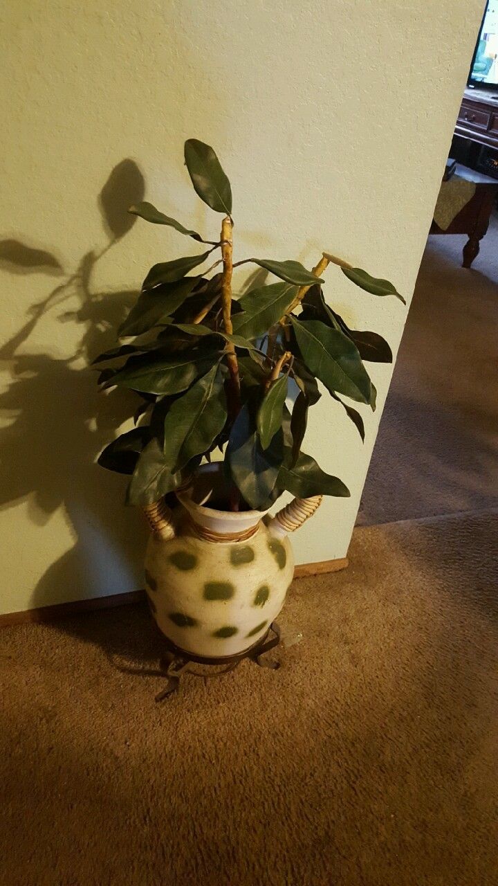 Plant feck con jarrón de barro con base de metal tiene 2 ramas de hojas $45 good condition only acepto cash