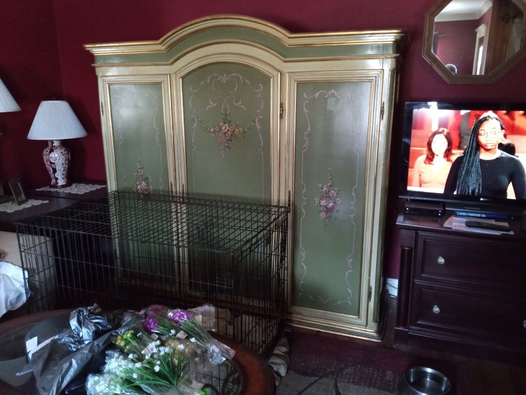 Beautiful French style armoire . Sold with matching end table and headboard. Will consider offers.