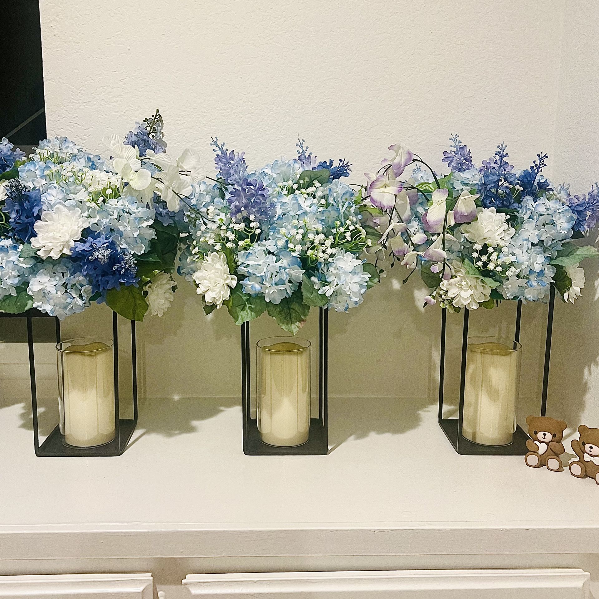 blue floral candle stand wedding centerpieces