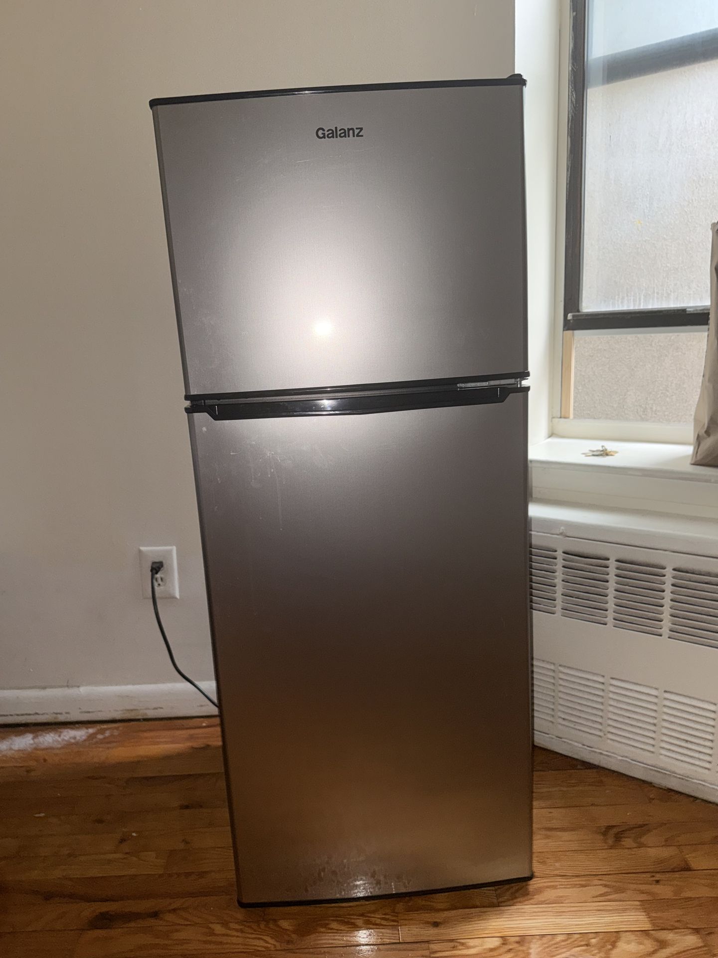 Galanz 4.6 cu ft Two door mini refrigerator with freezer. Stainless steel Adjustable shelves & thermostat with interior lighting Also has can dispenser and can hold 2L bottle in door