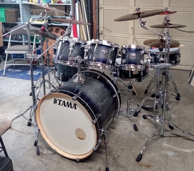 Maple shells 8",10", and 12" rack Tom's. 14", and 16" floor Tom's with a 14× 6.5" snare. Cymbols are Paiste 900 series and Pst7. 10" AND 12" splash 14" thin crash 16" and 18" crash 14" china and a 20" ride. Remo emperor heads, controlled sound head on snare. Iron Cobra 200 kick and clutch pedals. Vic firth 5a sticks and stick holder. All hardware included and some extras!