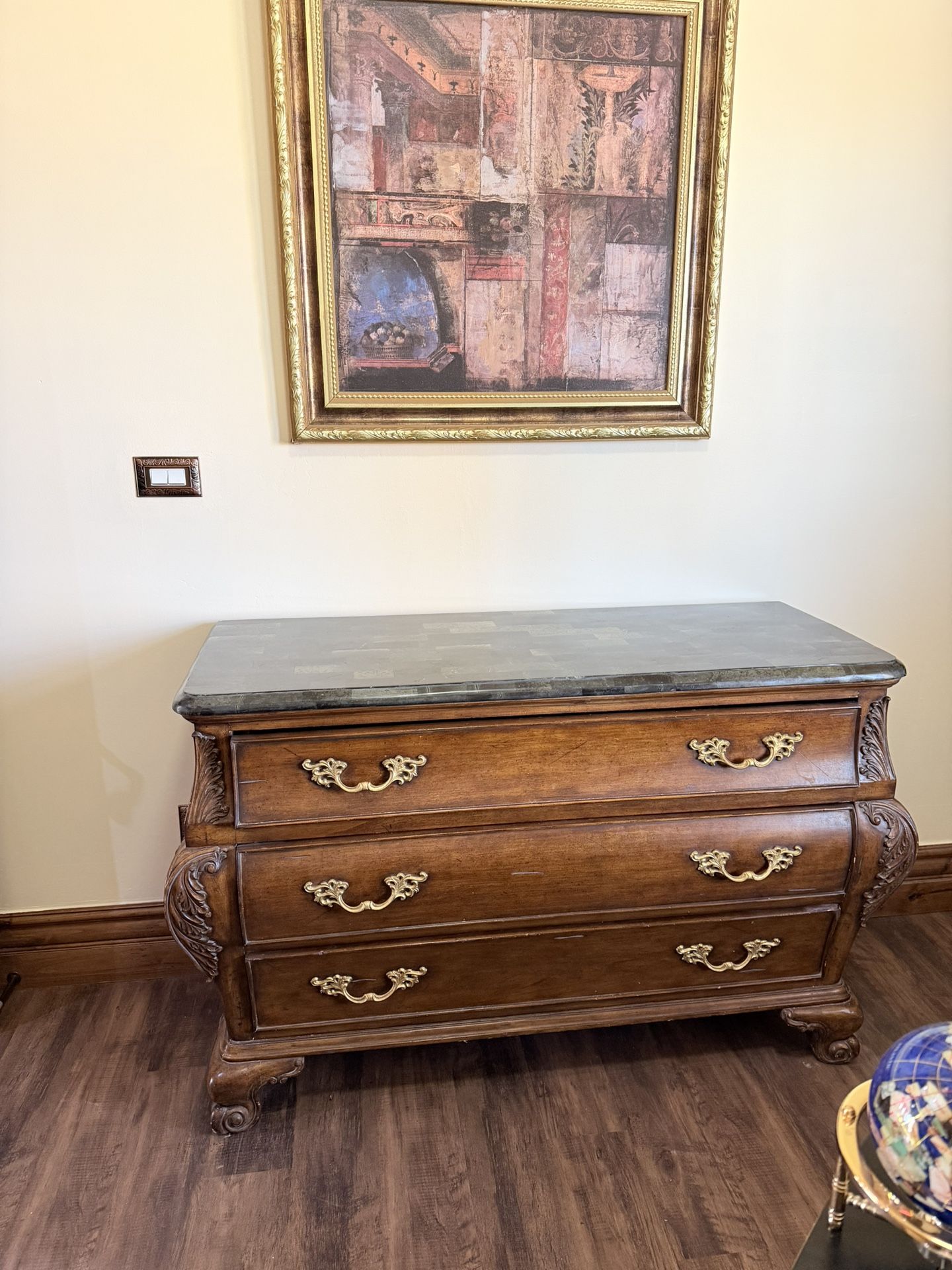 Very elegant designed credenza. Stained brown wood with golden handle accents. Green hard resin top. Top has a scratch as seen in picture. Otherwise in great used condition. Please see pictures for detailed angles. 50 in L x 20 in deep 33 in Tall