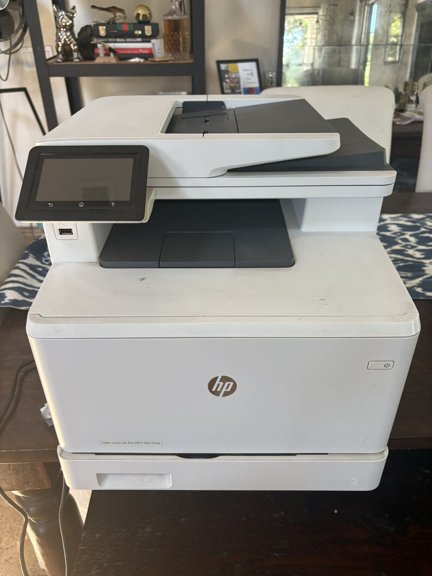 HP Laser Jet Printer M477fnw Works great All-in-one printer gives you printing, copying, and scanning capability. Has a resolution quality that goes up to 600 x 600 dpi for excellent readability. Network-ready wired, 1 x Gigabit LAN Ethernet, and 1 x USB 2.0, 2 x USB 2.0 host, 1 x modem connectivity.