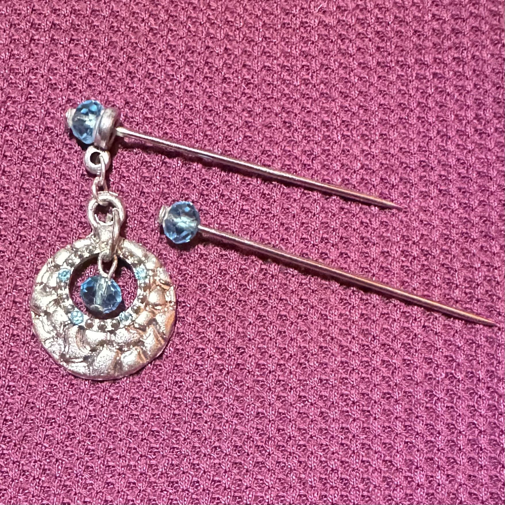 2 Steel Matching Blue Crystal Round Dangle Silver Tone Charm Hijab Pins Handmade strong. Pins are 2 inches long. Check out my other hijab pins and save on combined shipping. Thank you:)