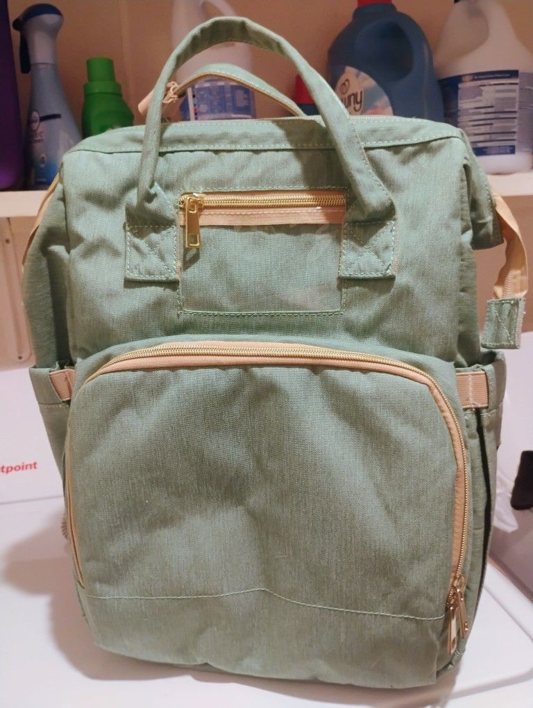 Backpack diaper bag with changer in the back. Has several compartments