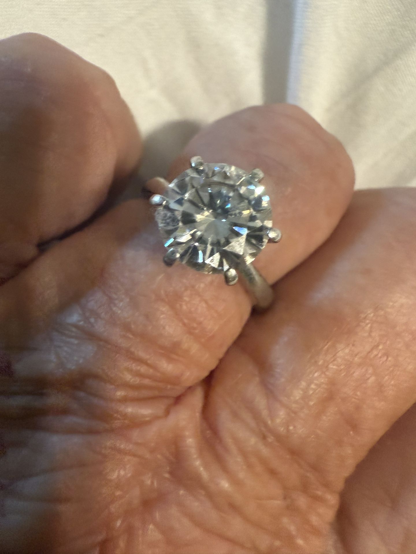 Product Information Moissanite Fire® 3.10ct diamond equivalent weight round, Platineve® solitaire ring. Measures 7/16"L x 1/16"W and is not sizeable. Actual moissanite weight is 2.75ctw. This ring has a beautiful beautiful shine to it. You will not be disappointed.