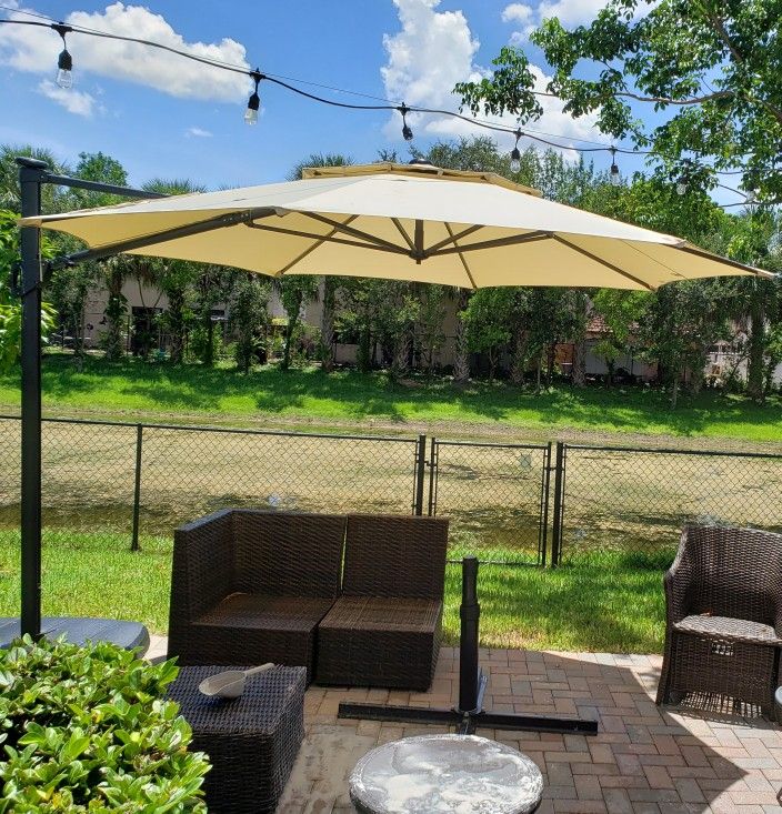 Used Allen Roth Patio umbrella with LED lights incorporated. This is Tan in color and it fully assembled. I recently installed a pergola and have no need for this. It also comes with a cover. The bases are filled and it only requires 2 screws to assemble. This Umbrella sells for $500 new and is currently being sold for $450. I'm not trying to make money, I'm trying to get rid of this.