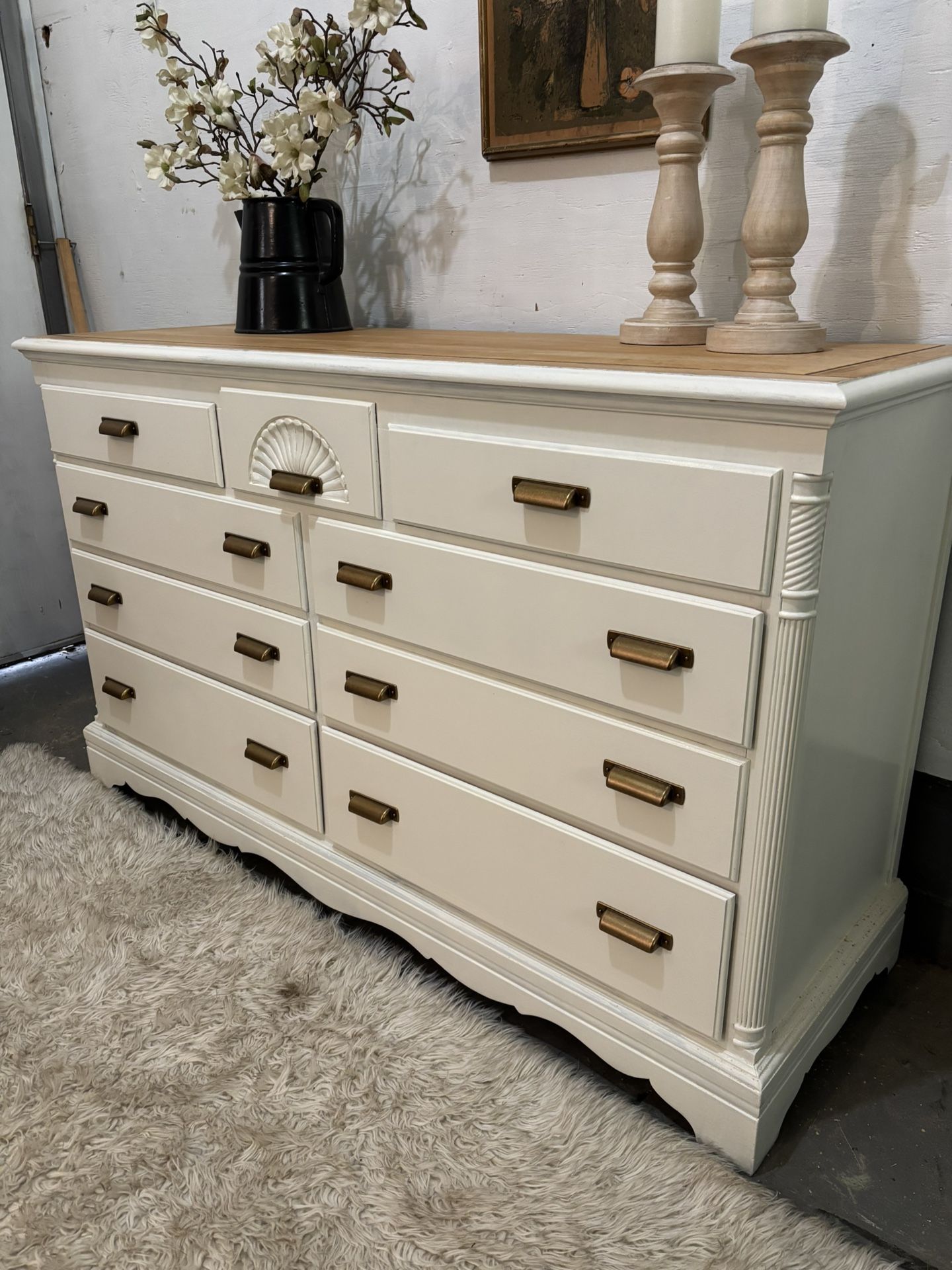 Absolutely stunning refinished dresser by Angelus Furniture Mfg. Co. of Los Angeles. It’s been updated in white and the top has been sanded down to natural wood and sealed for protection. New antique bronze hardware has been added to all nine drawers. Solid wood, dovetail construction with refined detailing and generous storage All drawers glide perfectly A timeless statement piece suited for a curated bedroom, entry, or dining space. Measurements: 57”w x 19”d x 34 1/2”h As with any vintage piece, there may be very minor imperfections in the wood or finish that add to its character Delivery 🚚 options available, Fcfs, xposted, Cash or Venmo