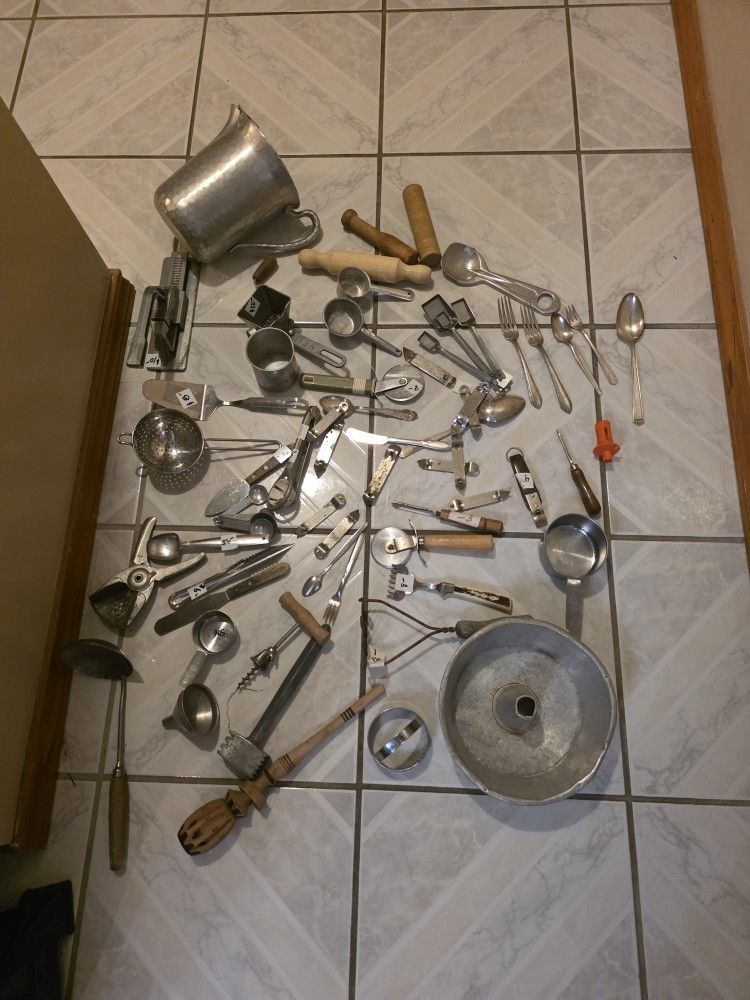 Vintage kitchen items, aluminum pitcher, bundt pan, coors bottle openers, pizza cuttrr, juicer, meat hammer, funnel, wine opener, cookie cutter, measuring cups, measuring spoons, potato peeler, bean smasher Pick up in Harlingen, I live near Walmart Antiques, Telephone, Flags & Collectables