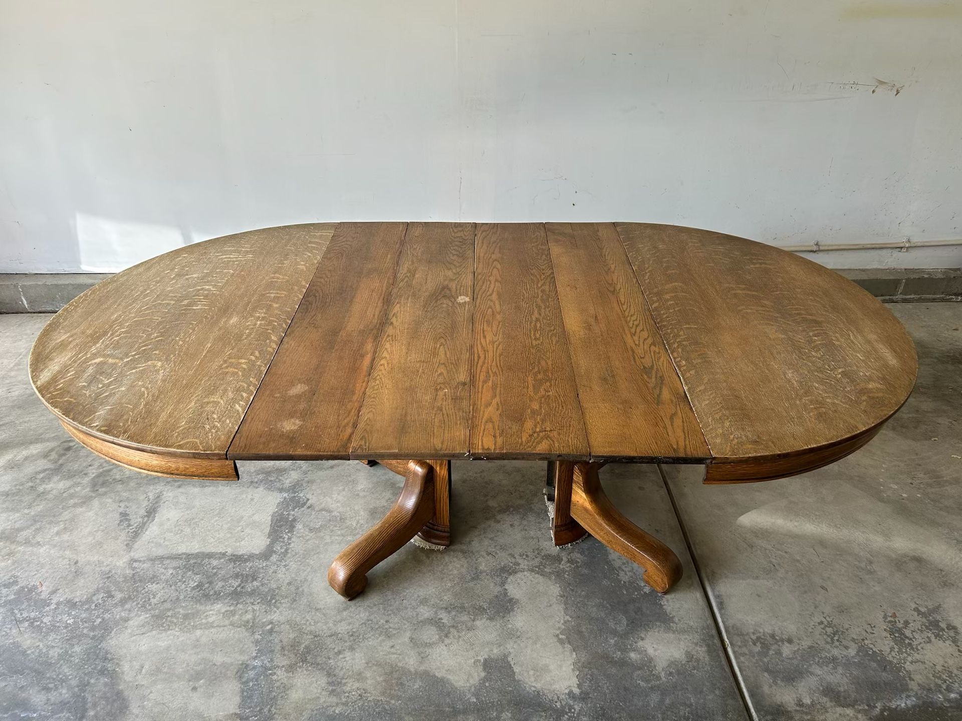 100+ years old, Oak veneer, solid oak leaves, Hight : 28 1/2” w/out leaves: 4’ diameter (W/ leaves)Length : 7’ (W/ leaves)Width : 4’