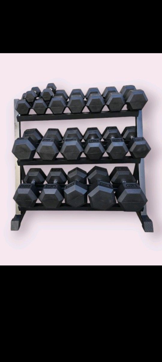 RUBBER HEX DUMBBELLS SET: 5-50lb. WITH THE RACK. Very convenient for training at home. 2×5lb. 2×10lb. 2×15lb. 2×20lb. 2×25lb. 2×30lb. 2×35lb. 2×40lb. 2×45lb. 2×50lb. =$650 I ALSO HAVE: 55lb. - 100lb. 2×55lb. 2×60lb. 2×65lb. 2×70lb. 2×75lb. 2×80lb. 2×85lb. 2×90lb. 2×95lb. 2×100lb. WITH THE RACK. = $2500. I CAN DELIVER FROM $20 TO $50. DEPENDING ON THE DISTANCE.