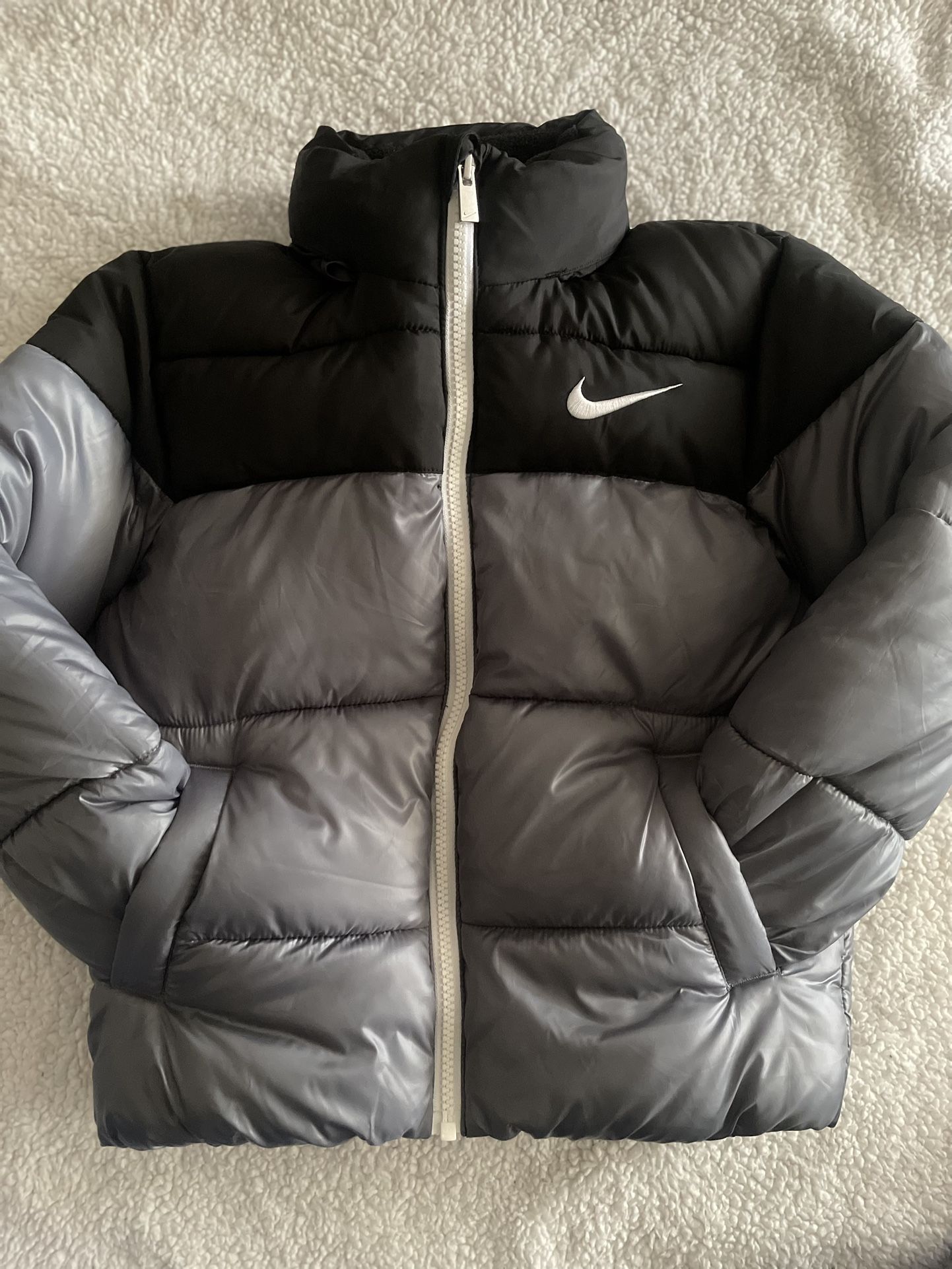 Little boys Nike puff coat, Gray and Black, high collar with hood tucked inside of collar. Size is for 5-6yrs. Extremely warm, cute and durable. Very good condition, worn a few times. Coat has been washed and sanitized.