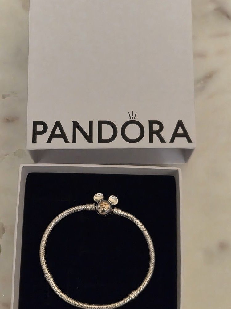 New Pandora Disney 100th Anniversary Moments Snake Chain Bracelet Make precious memories last forever with our Disney 100th Anniversary Moments Snake Chain Bracelet. Hand-finished in sterling silver, this limited edition collector’s piece features a Mickey Mouse-shaped clasp with a 14k gold circle engraved with “Disney 100”. Style it with your favourite Disney x Pandora charms to celebrate 100 years of wonder. Includes: Bracelet, Pandora Box and Pandora Gift Bag. Excellent for a Gift 🎁