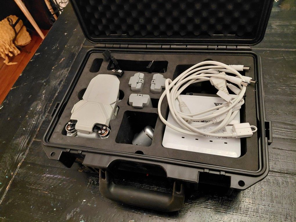 The drone is flawless, adult owned and flown. Comes with: *Battery Charger (Fast charge simultaneously) *Three batteries *Watertight hard case *Mant phone patch cords *Extra props