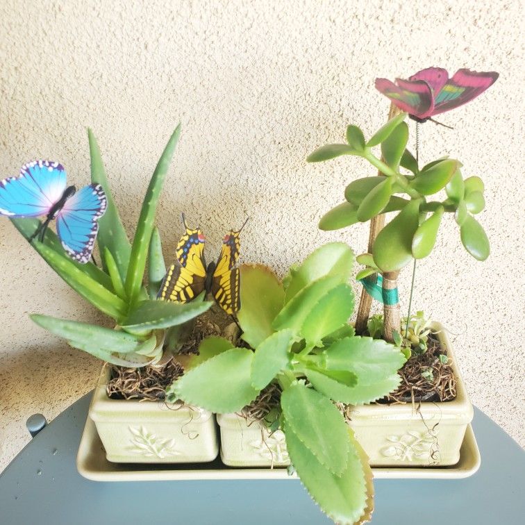 Great Mother's Day gift. Hardy Succulents In Decorator 3 Ceramic Pots & Tray. Plants include: Mother of Thousands, Aloe Vera & Money Tree. Measures 11" wide x 4"deep. Total heigth is 11". Butterflies are included.