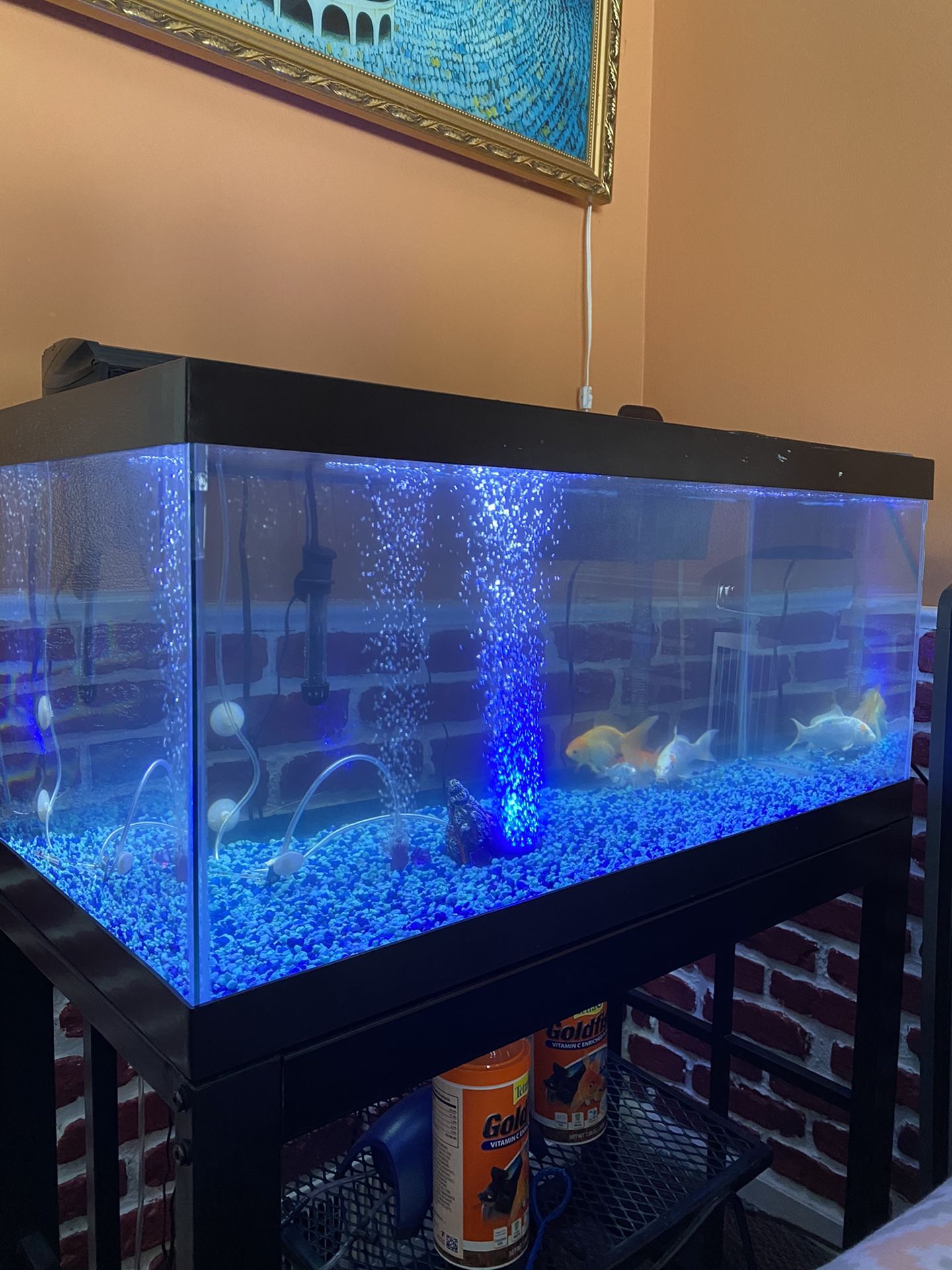 50 gallon fish tank. everything works perfect. I am moving and have no space for it. Everything is included for $400 or best offer. Feel free to send an offer anytime. Koi fish not included Filter Led lights 2 Bubble maker 50 gallon pump Heater Rocks Stand