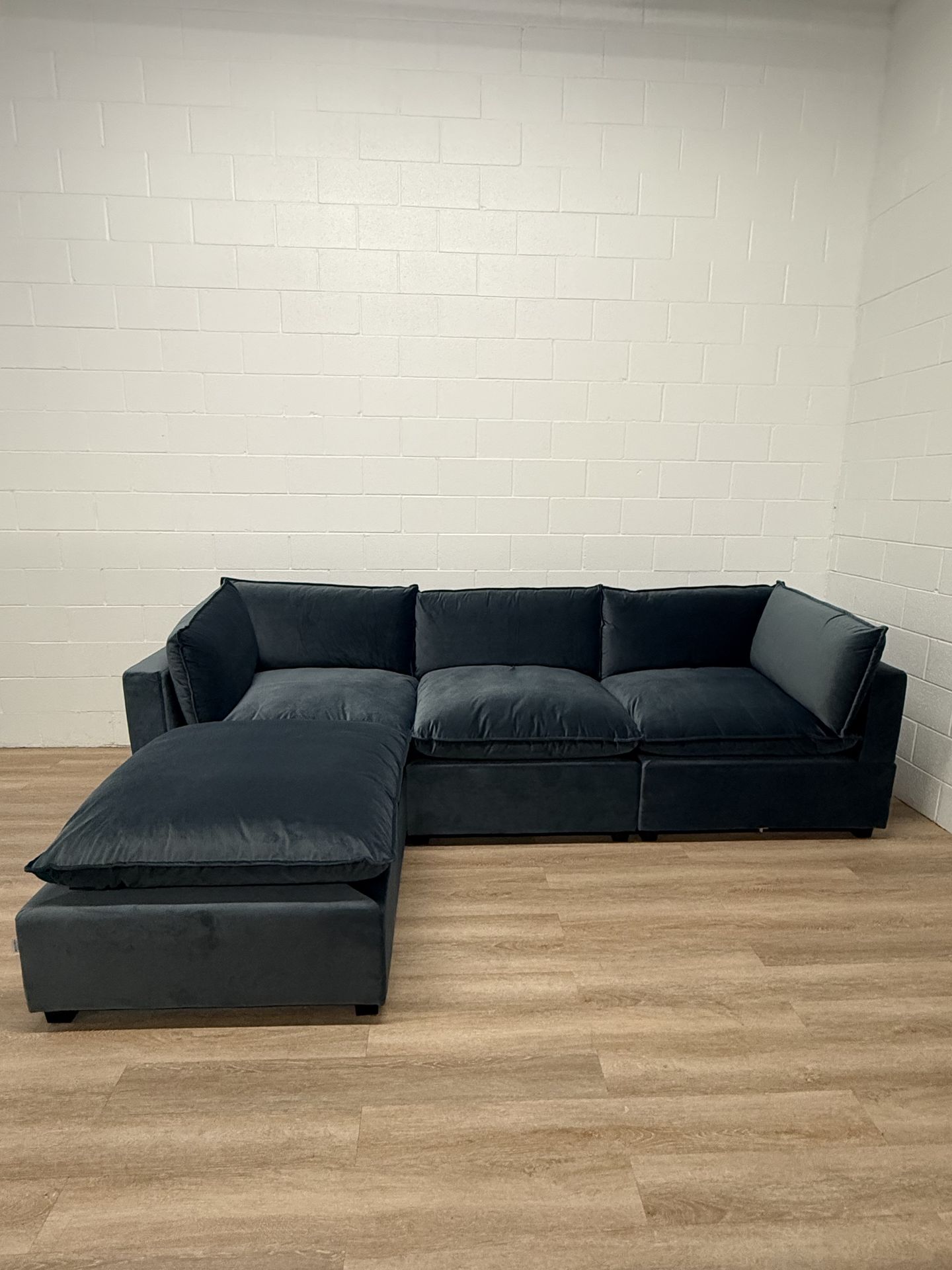 Bellamia Collections Luna modular sectional in Dusty blue performance fabric. Comfortable deep seating with a simple modern look. Modular design — pieces can be rearranged to fit your space. Measurements: Width: 122” Chaise length: 79” Depth: 42.5” Height: 31” Seat height: 19” Seat depth: 29” Details: • Removable washable covers • Performance fabric (easy to maintain) • Matching ottoman included • Cushions stay in place • Neutral color Good size for living room, basement, or apartment. Pickup in Rolling Meadows Delivery available Cash or Zelle If interested, send a message.