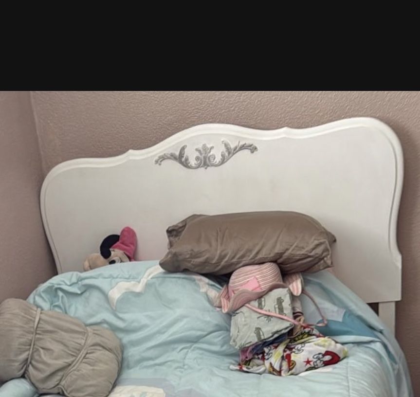 White with gray flower accent on head and foot board as shown. Twin size. Comes with slates. Price is firm.