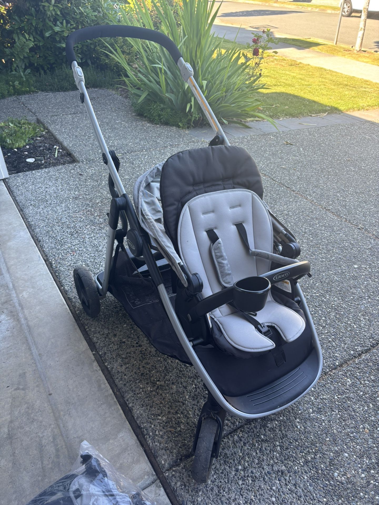 Rarely used and like new double stroller. The Ready2Grow™ LX 2.0 includes two seating positions, which can accommodate two Graco infant car seats at once, making it a great stroller for twins and siblings close in age. Plus, remove the back seat and easily convert to a bench seat or a standing platform for your big kid to ride along.